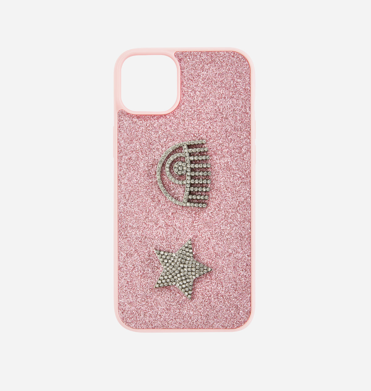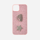 iPhone 14 PLUS Cover with pink glitter and Eye star application in metal and rhinestones.