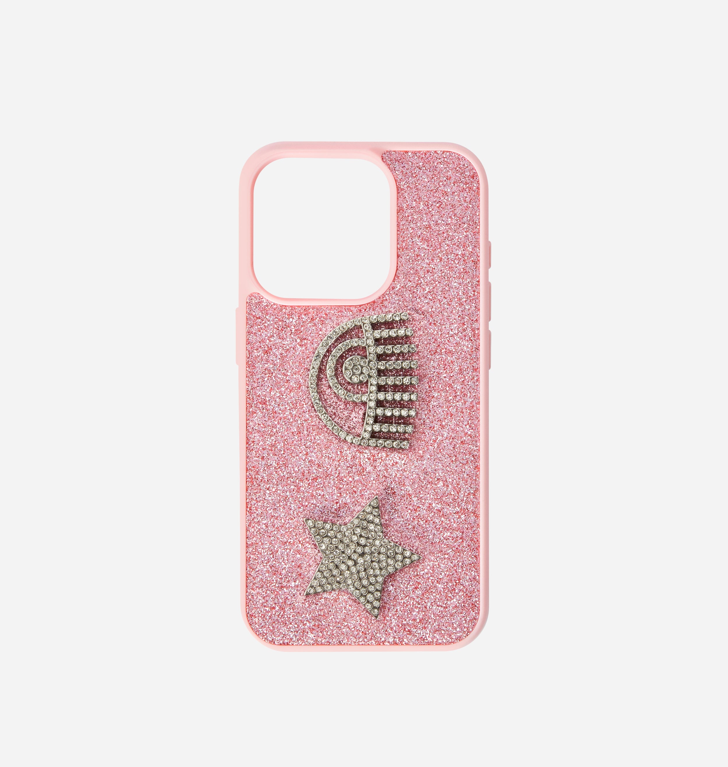 iPhone 15 PRO Cover with pink glitter and Eye star application in metal and rhinestones.