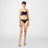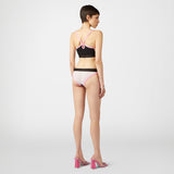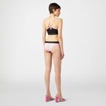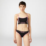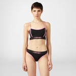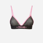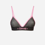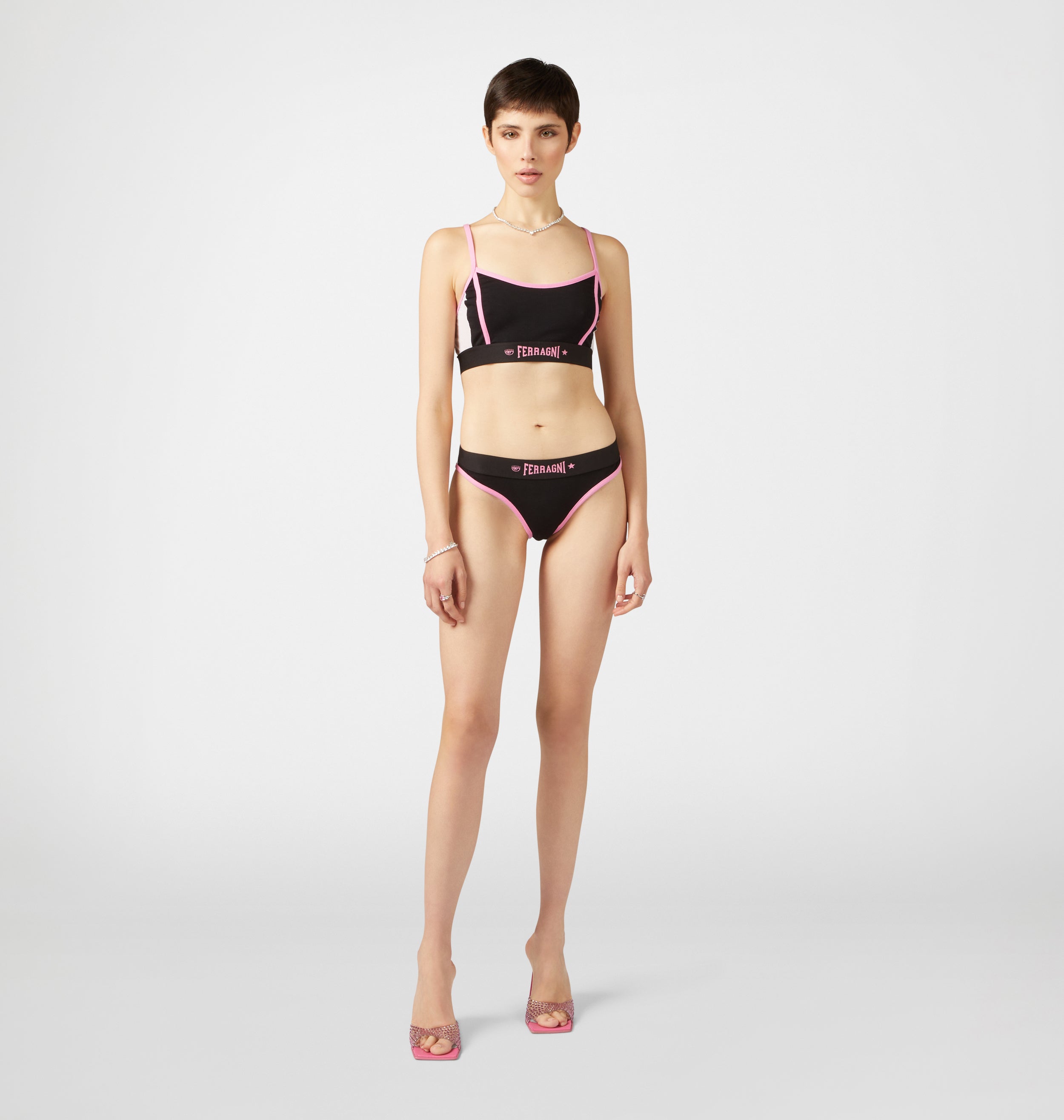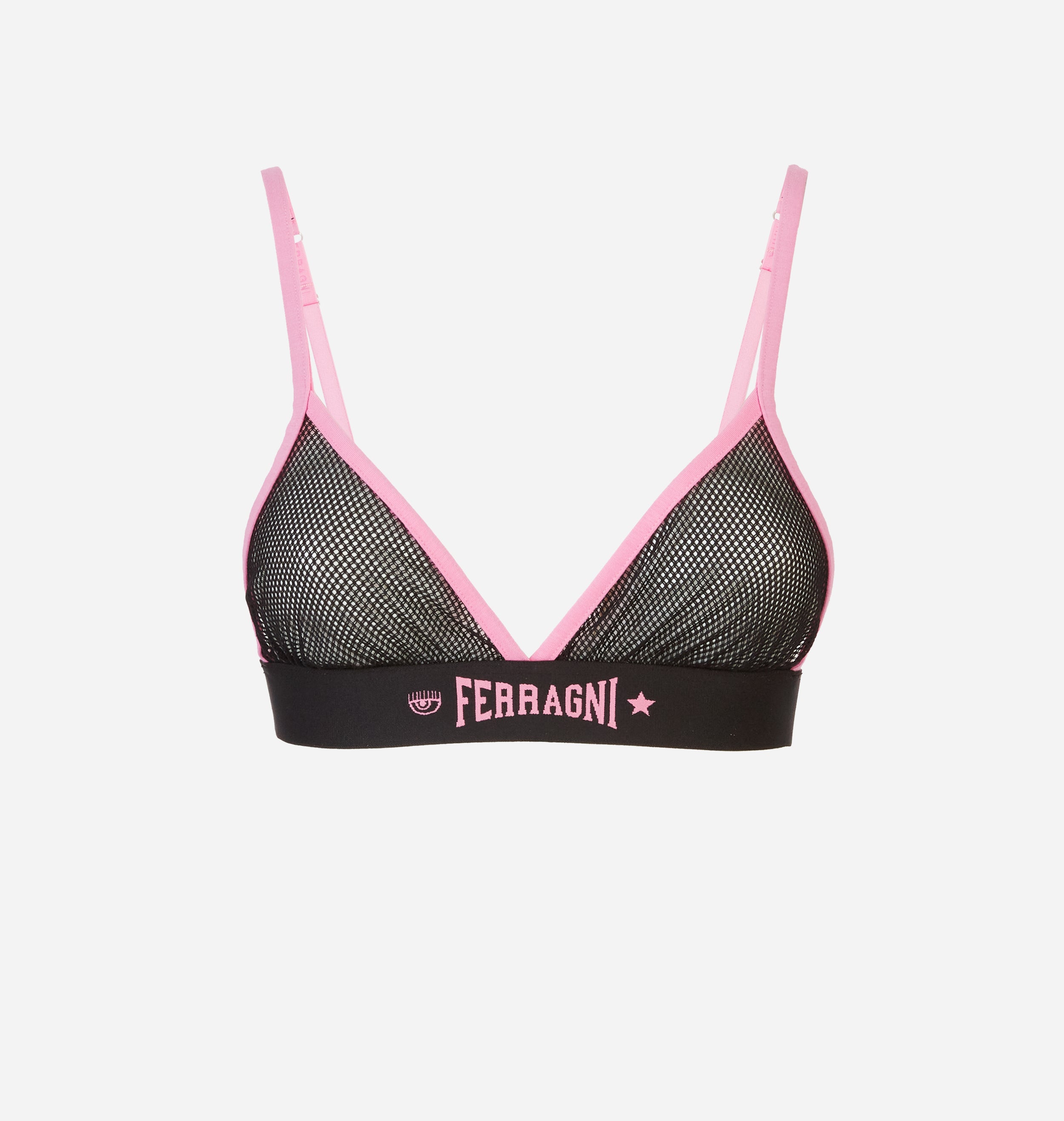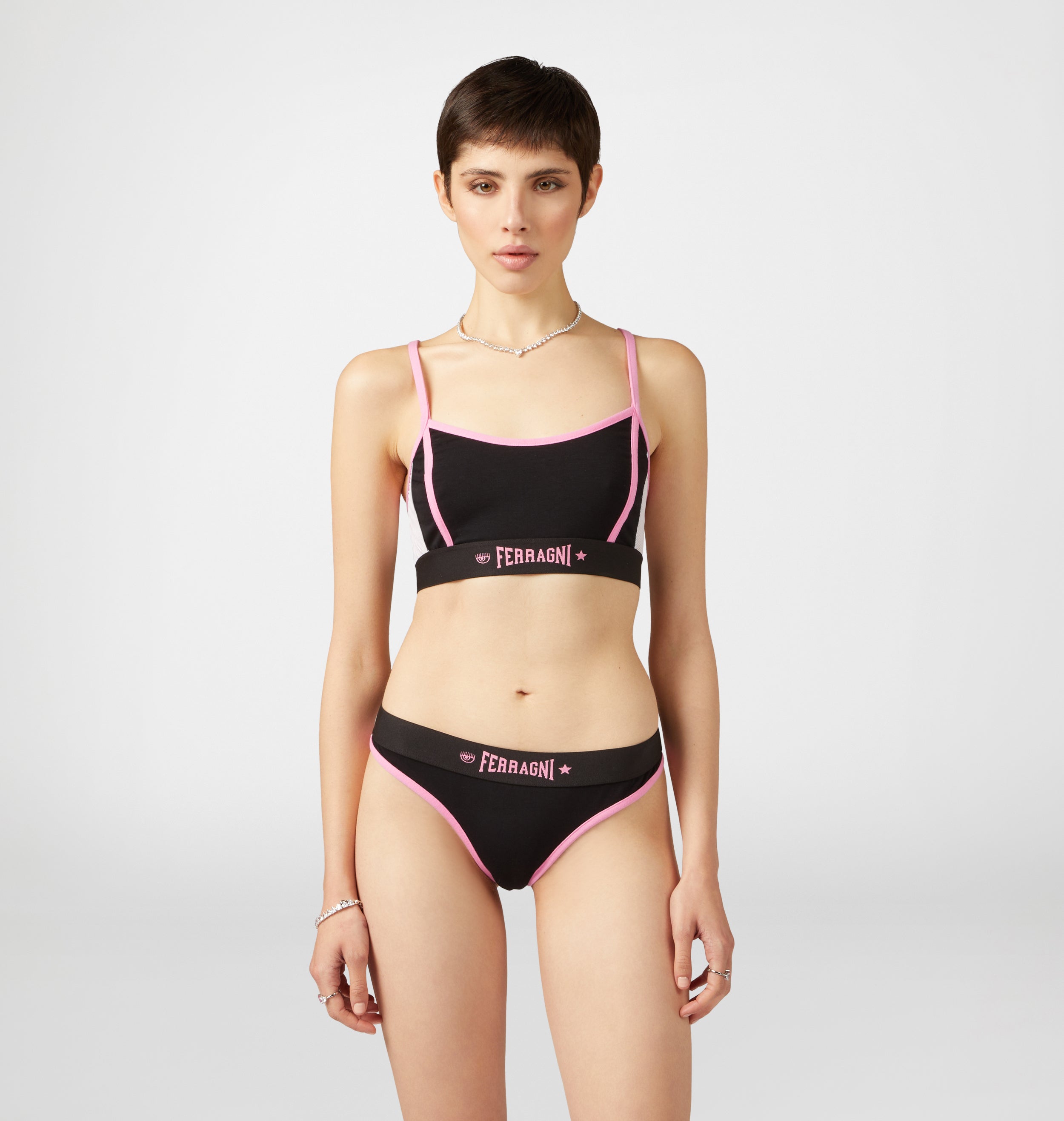 Black cotton bralette, elastic band with Ferragni Stretch logo and white micro net details
