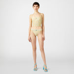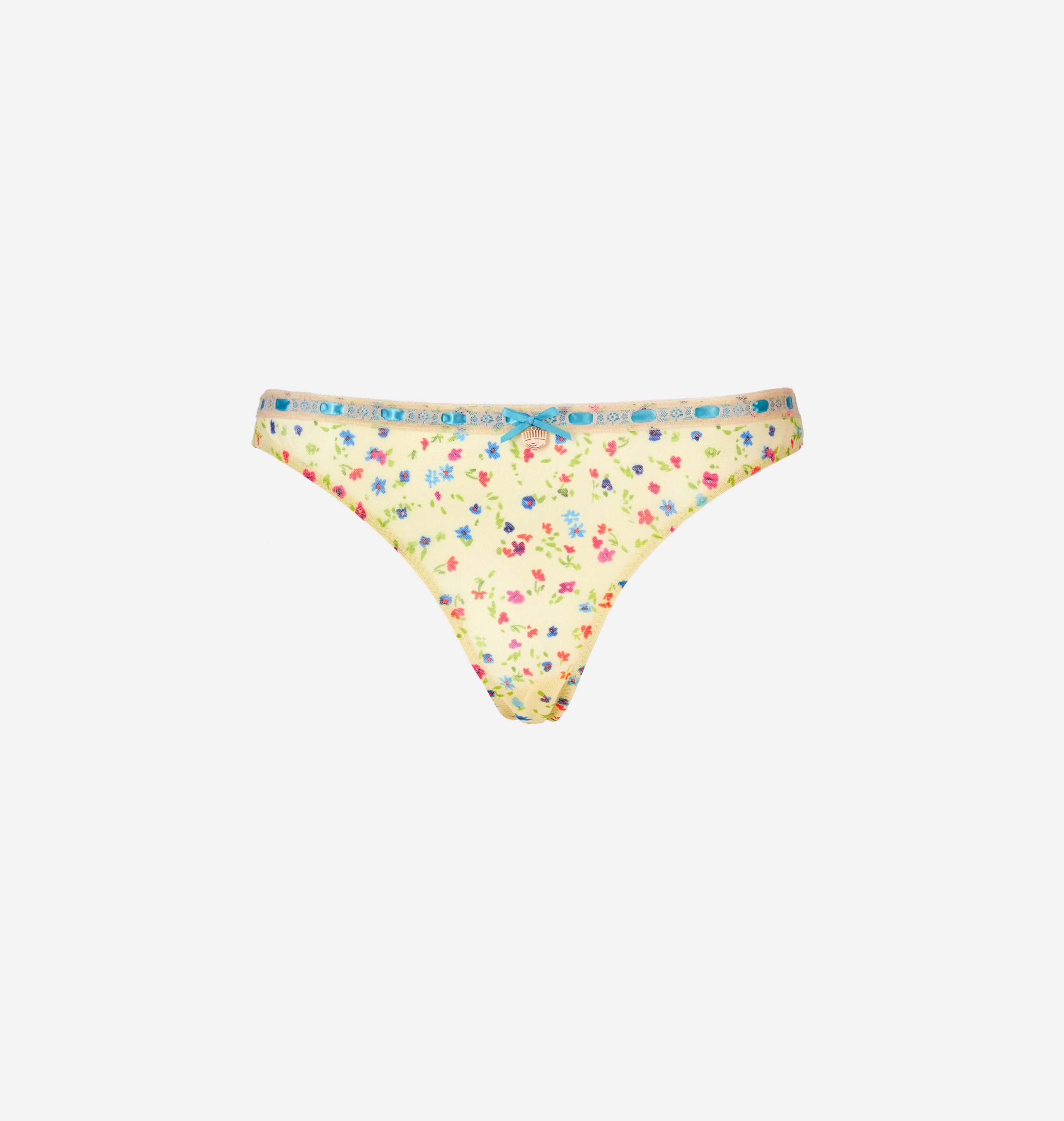 Yellow brazilian briefs with micro floral print and a light blue bow with Eye Charm
