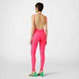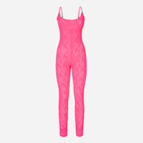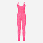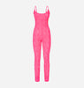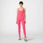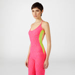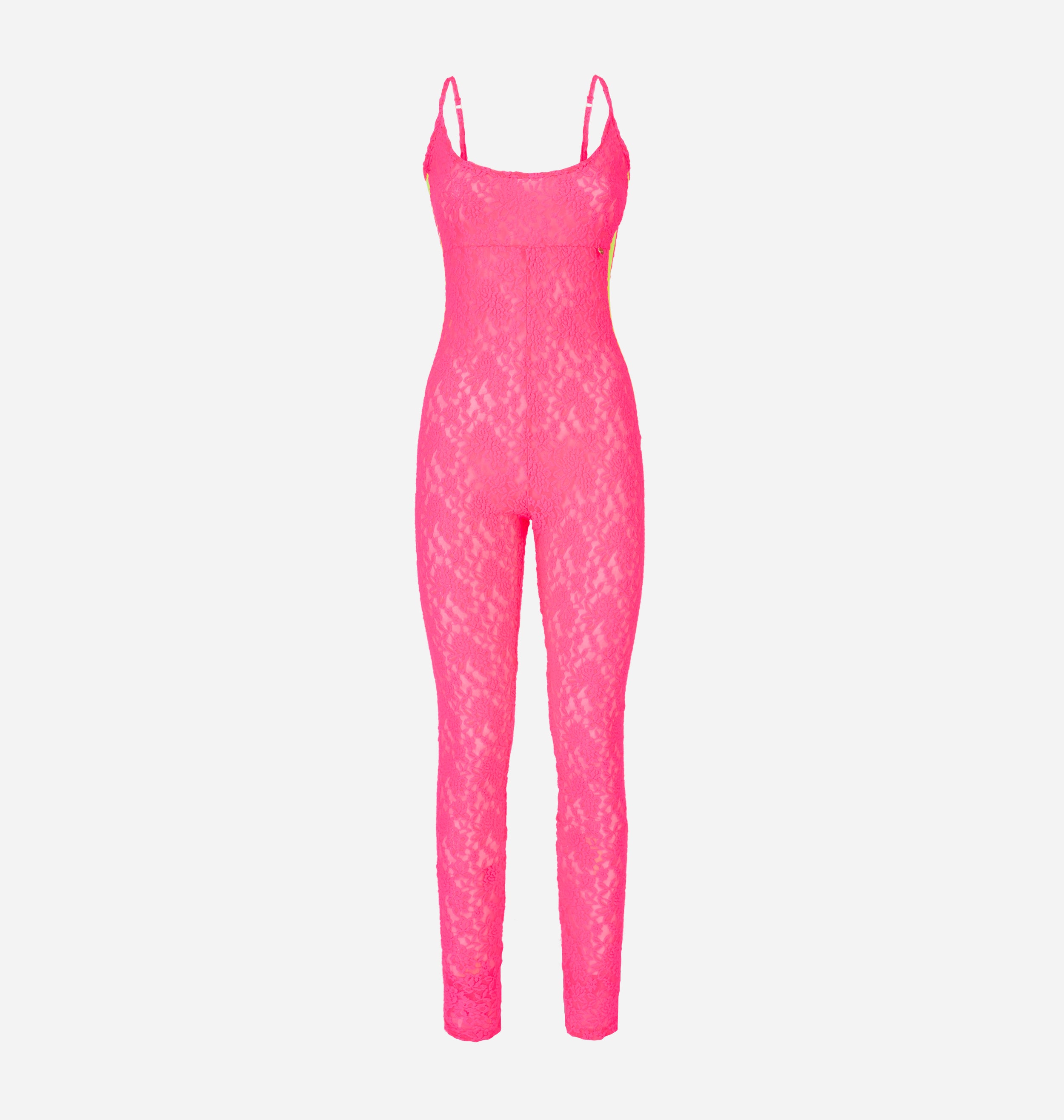 Fluo pink lace sleeveless jumpsuit with fluo yellow mesh details and wide back neckline
