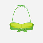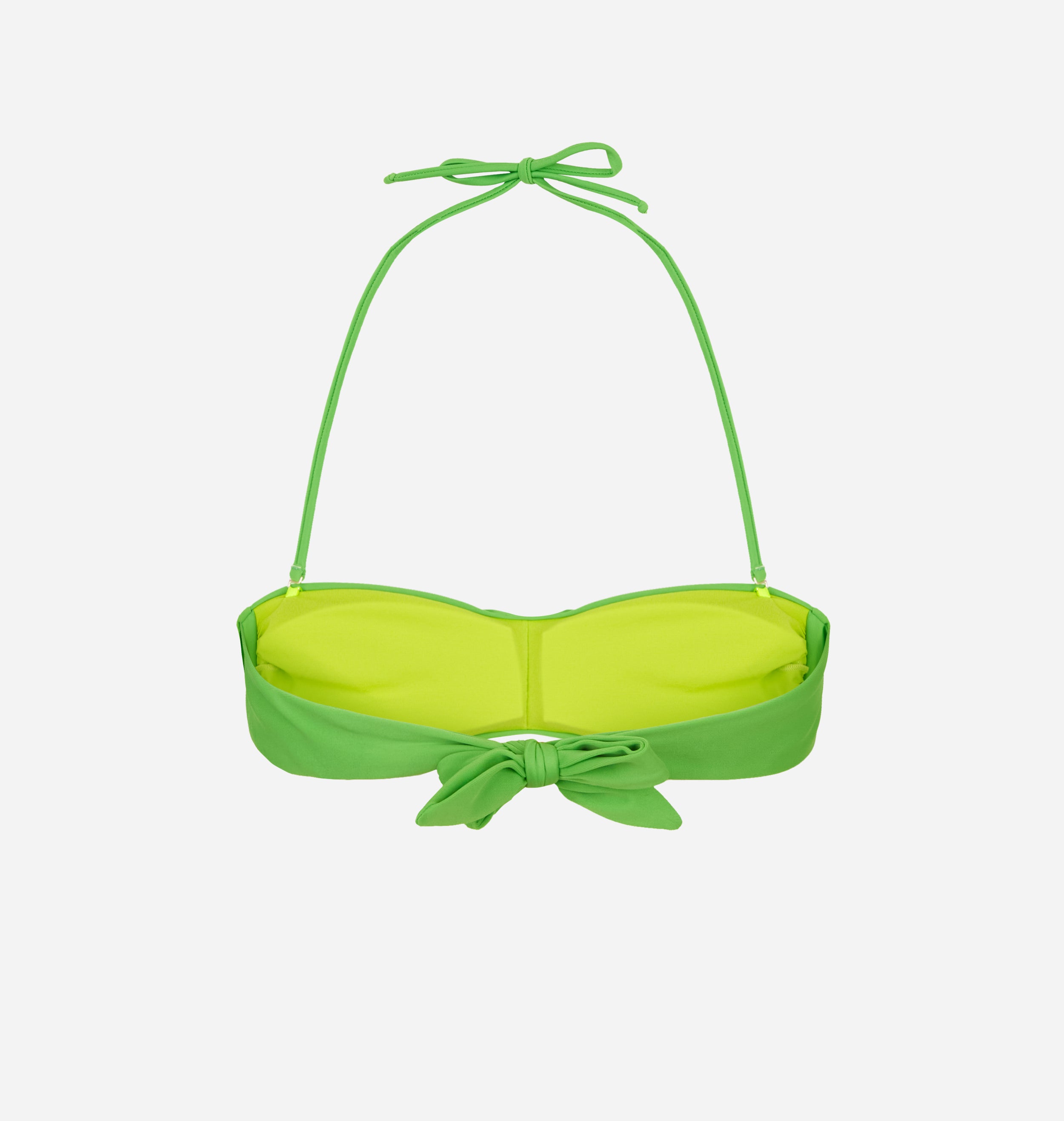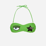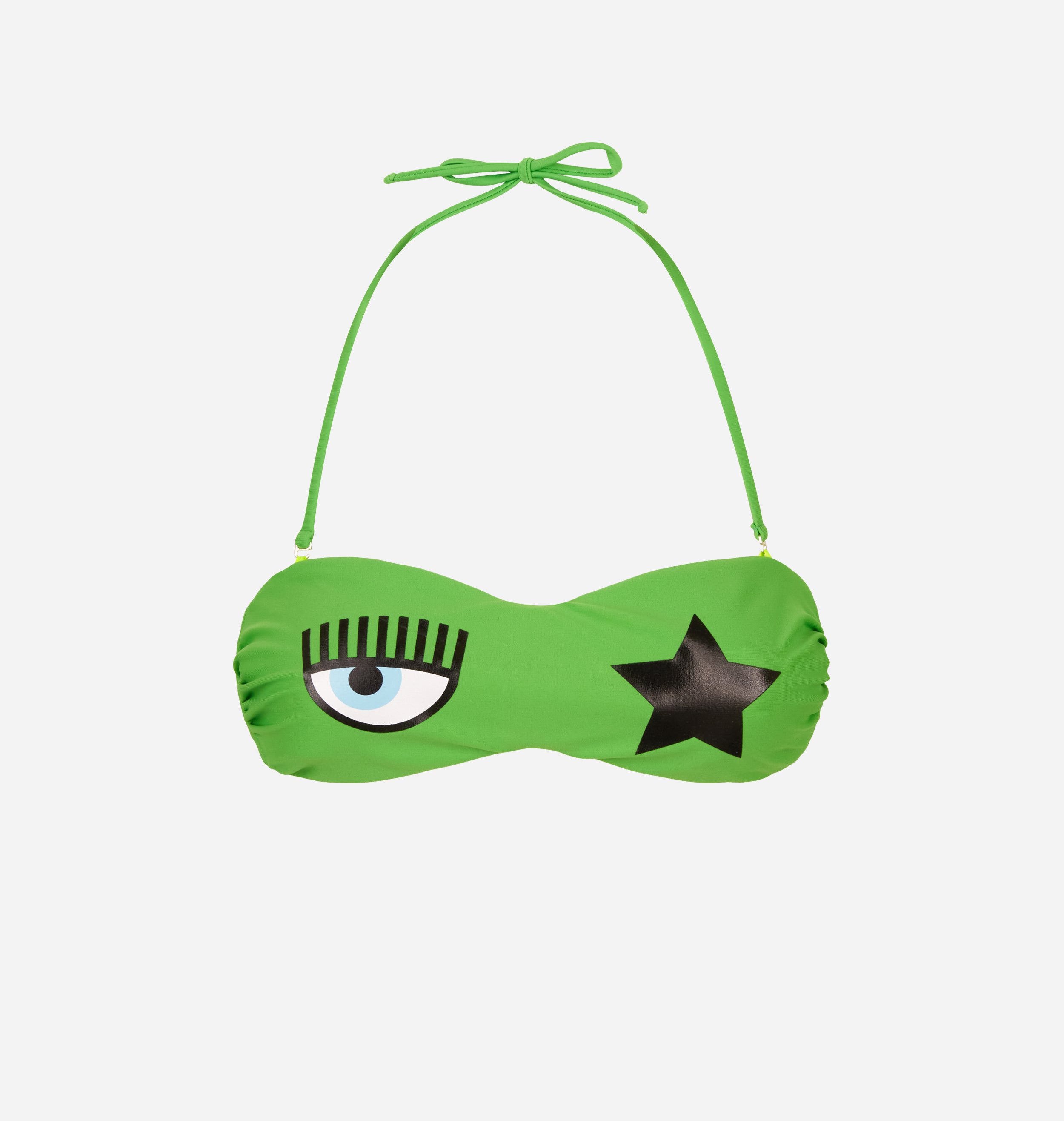 Green bikini top, lightly padded bandeau model with Eye Star print. Removable straps