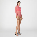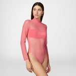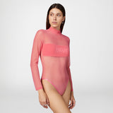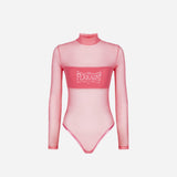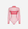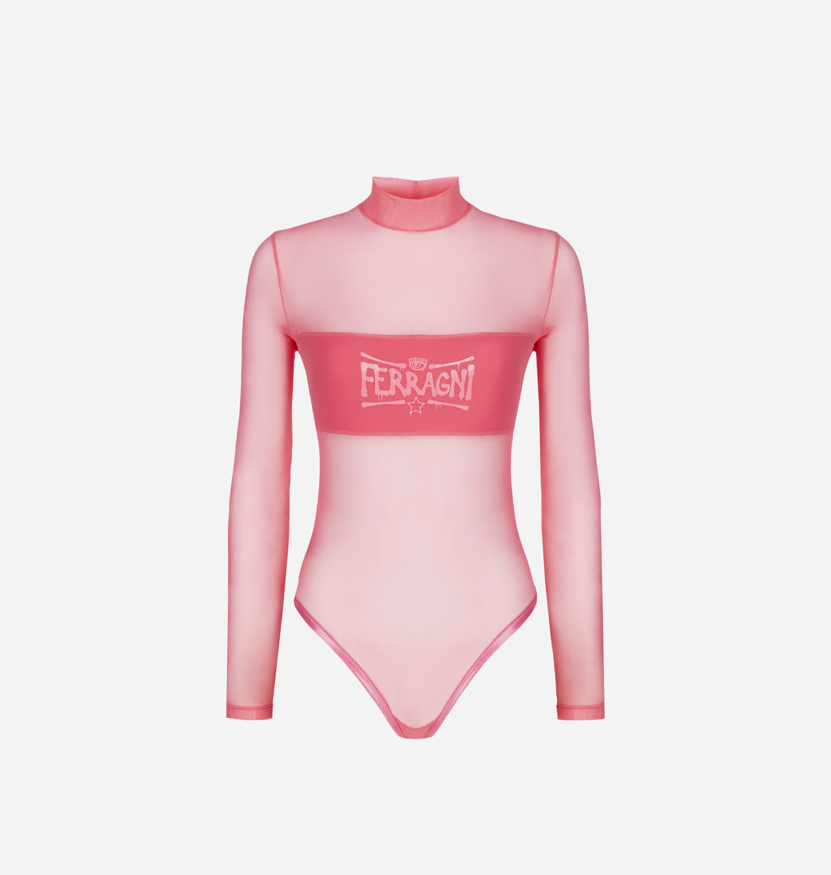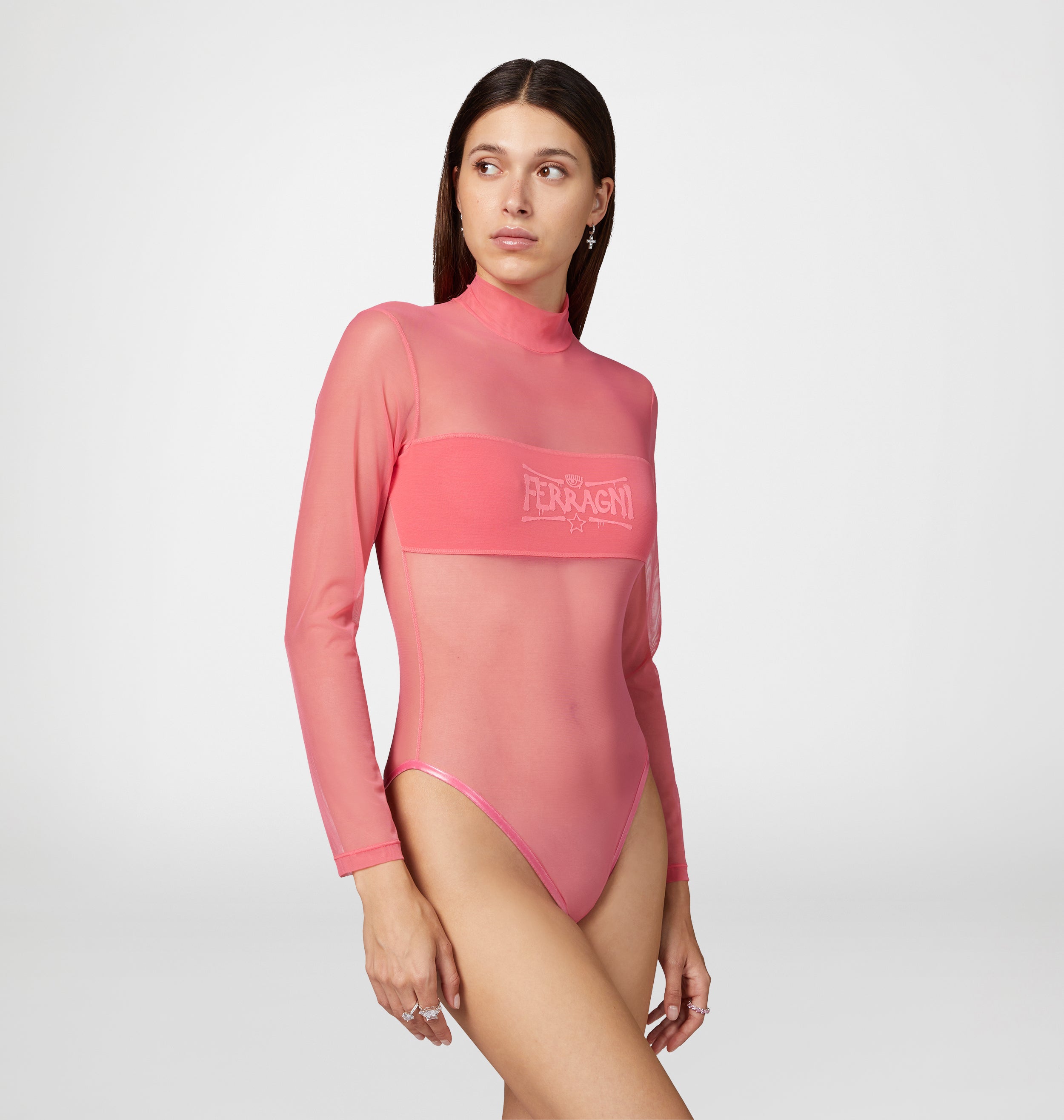 Pink stretch tulle bodysuit with long sleeves and high collar, bandeau bust cover-up and Ferragni graffiti print.