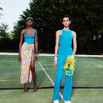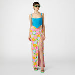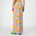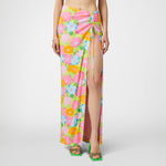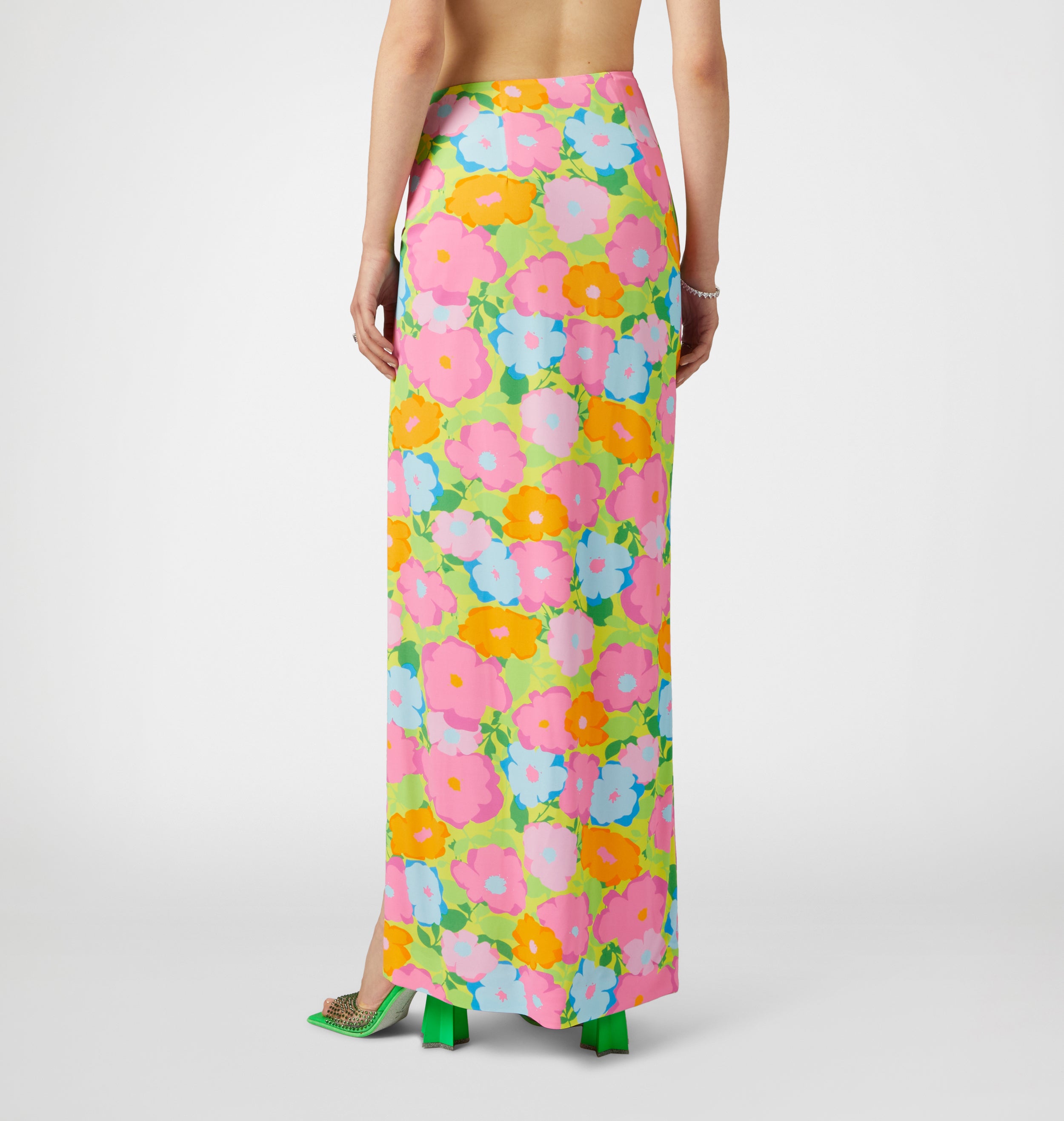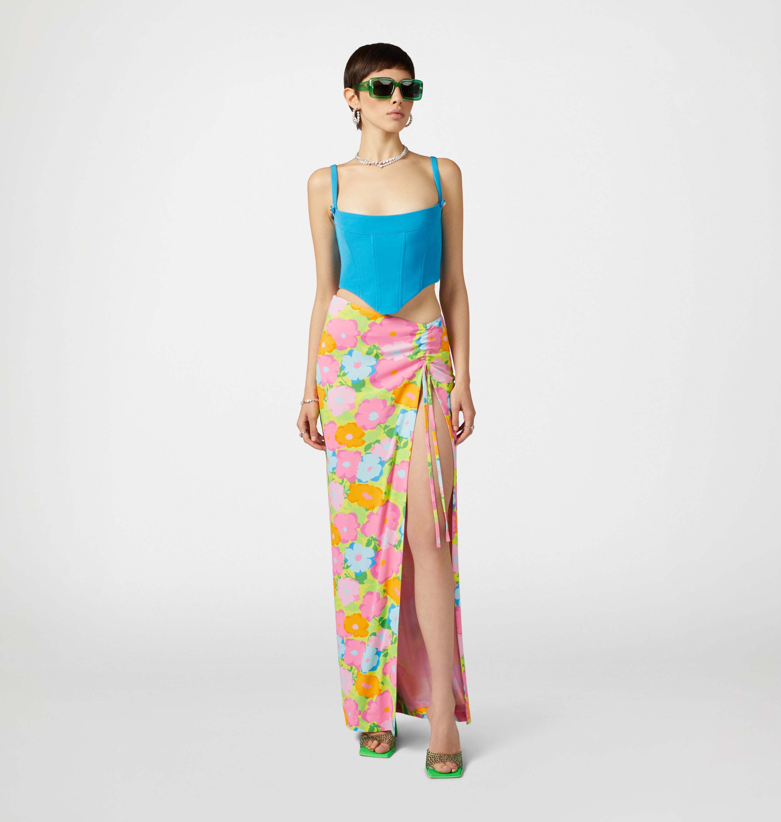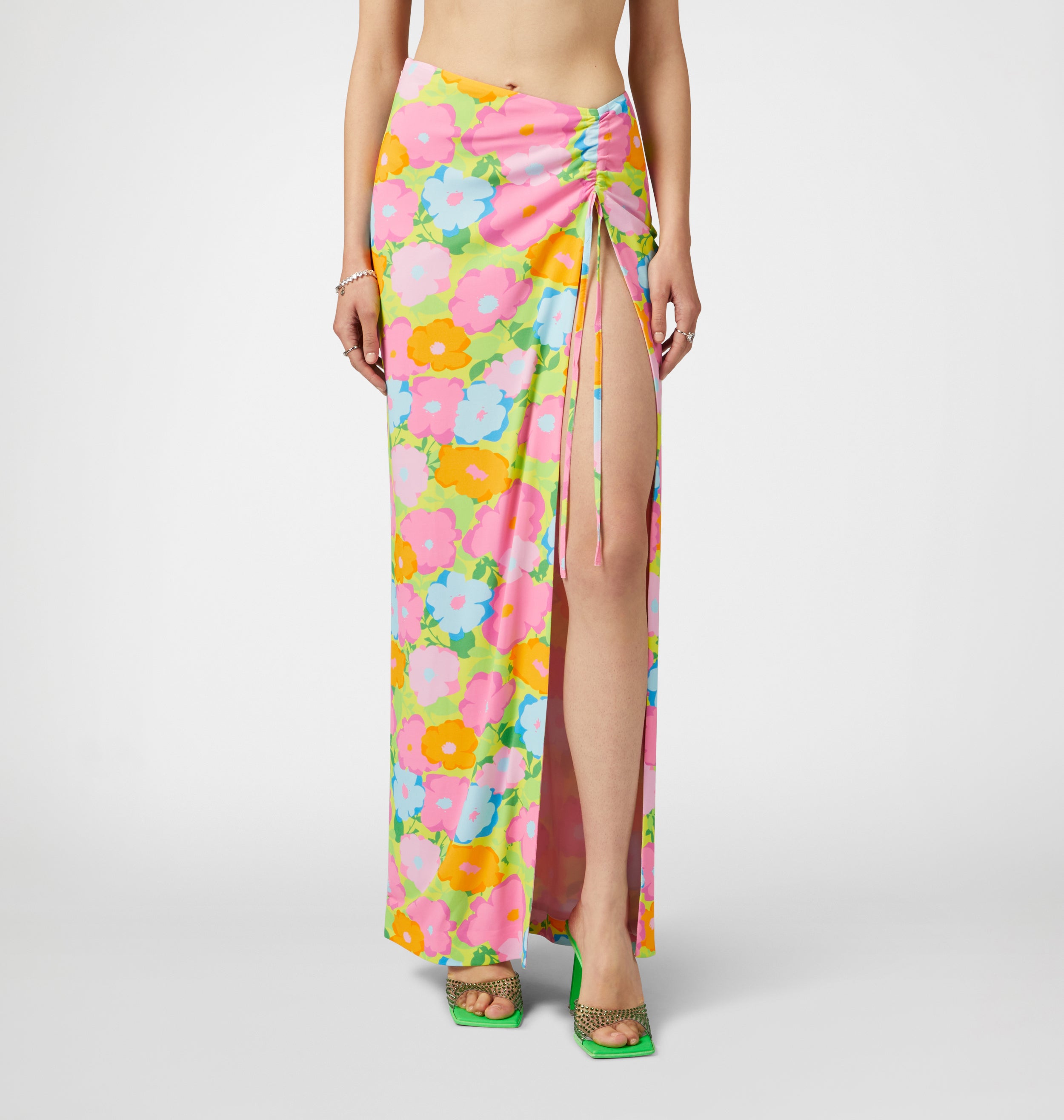 Flower print lined technical jersey skirt, pencil line with wide slit and drawstring detail