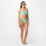 Water green bikini top, soft bandeau model with ties and golden detail with maxi rhinestones. Metal hook fastening.