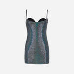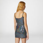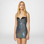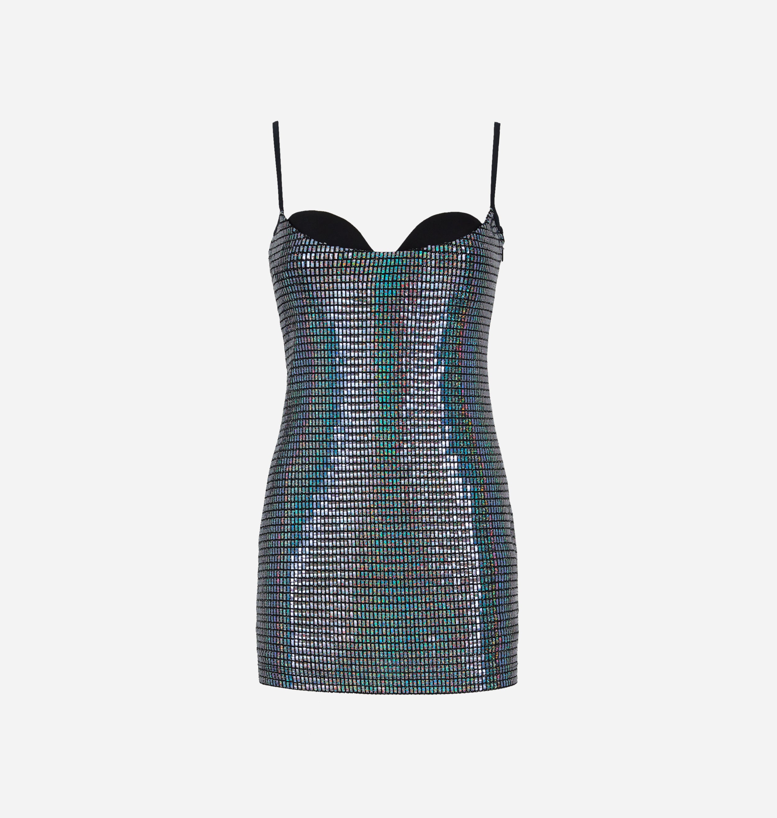 Sleeveless short dress in a stretch fabric with mirrored and iridescent details