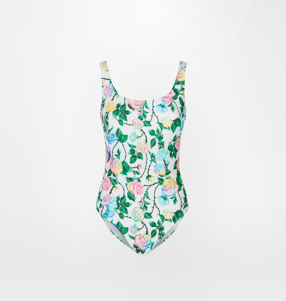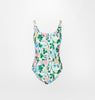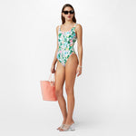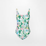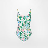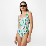 White one-piece swimsuit in Roses print.
