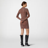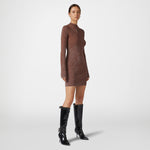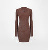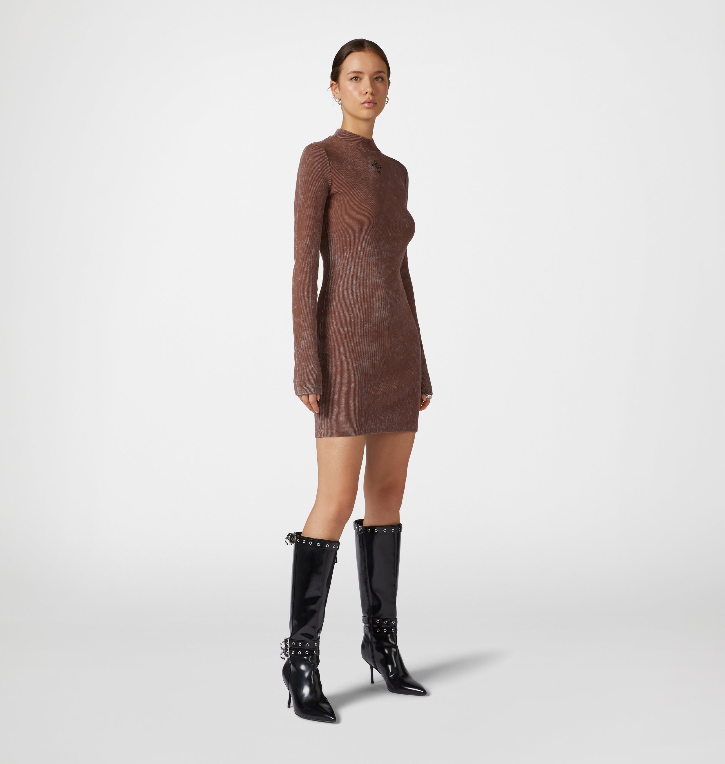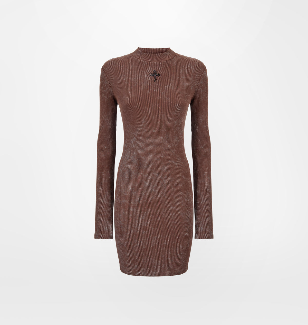 Brown long-sleeved ribbed dress with marbled effect and embroidered cross. Slim fit.