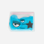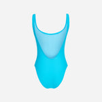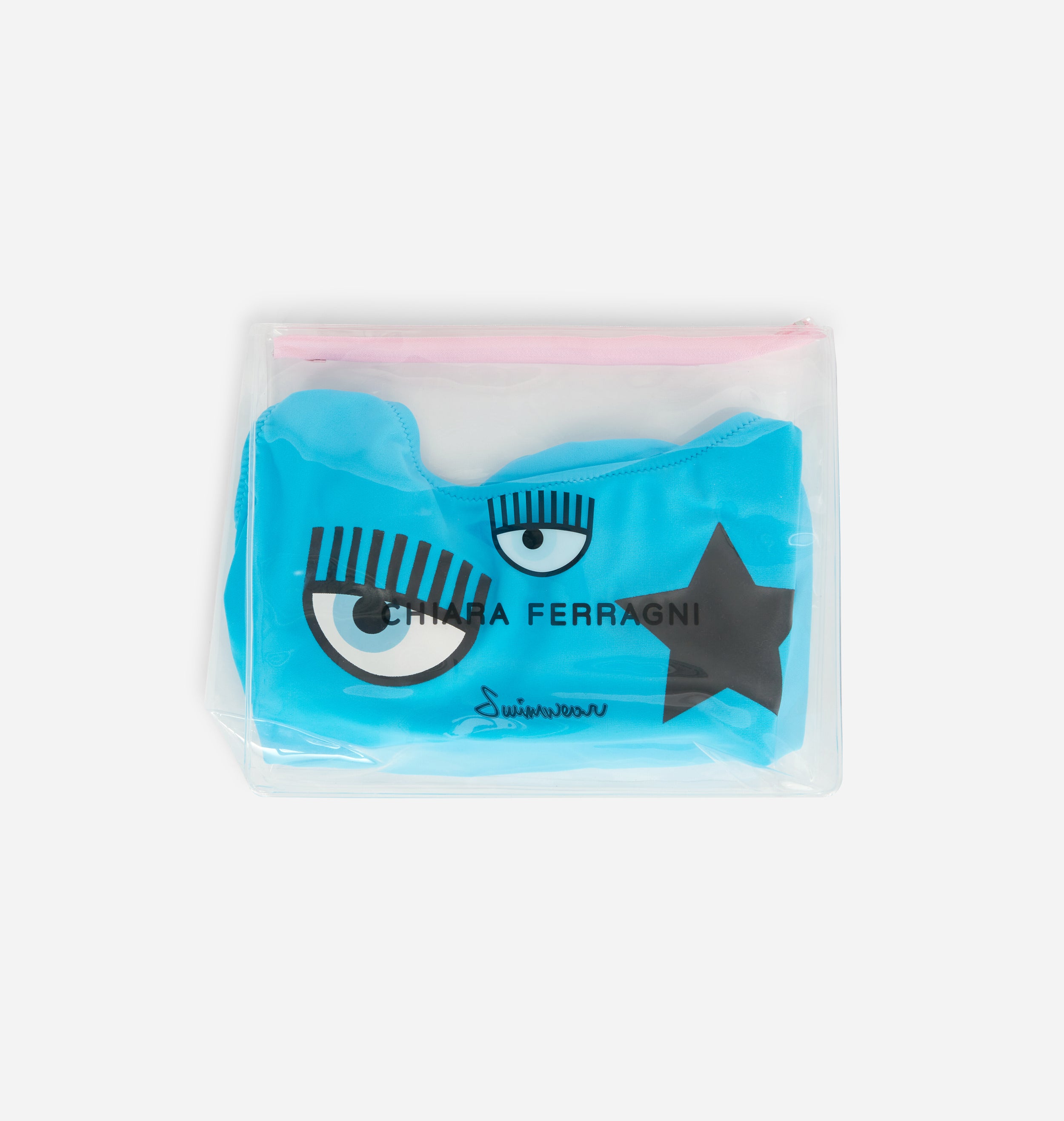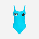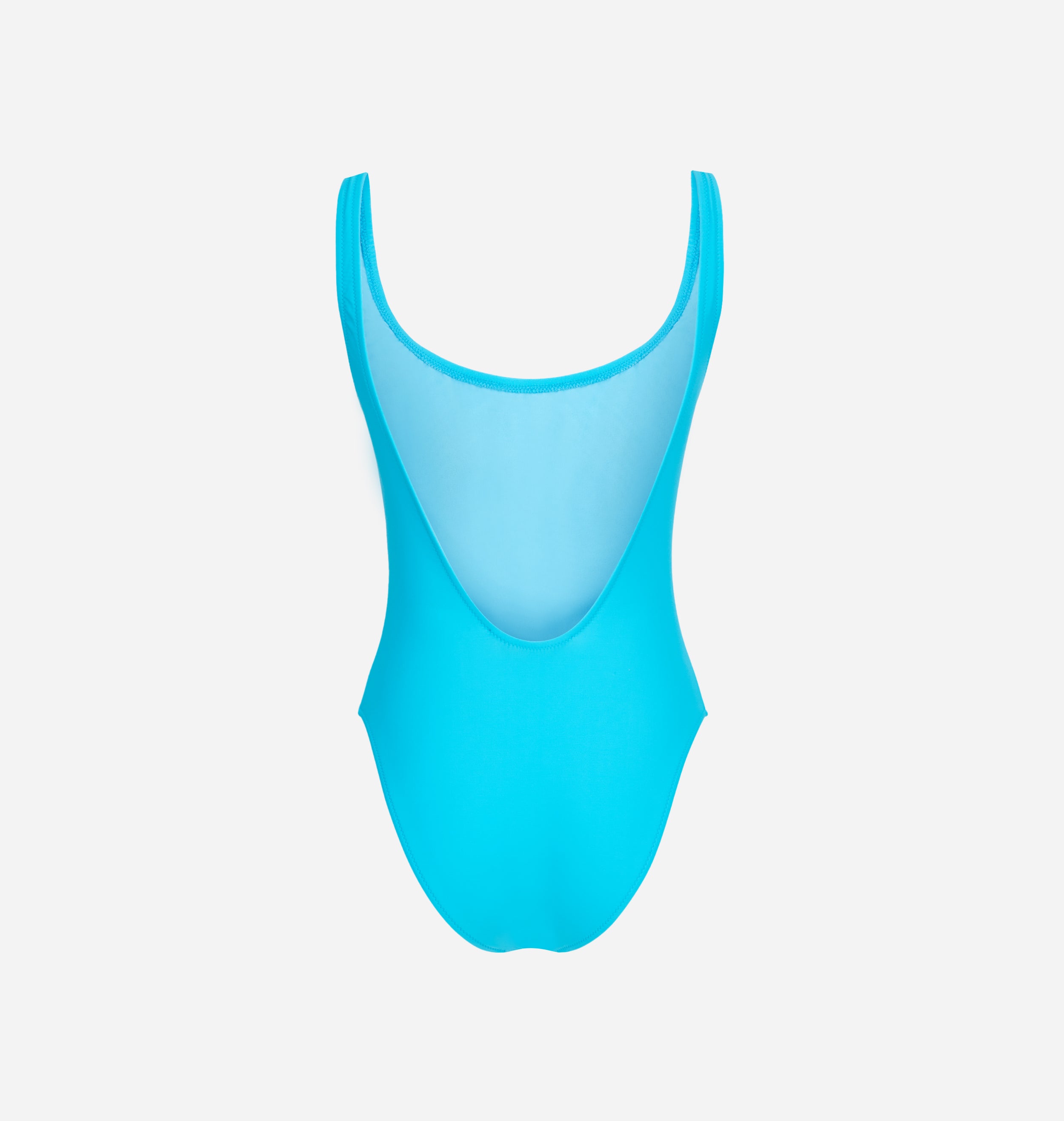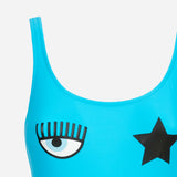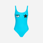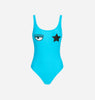 LIGHTBLUE ONE-PIECE SWIMSUIT WITH PLUNGE BACK AND EYESTAR PATTERN ON THE FRONT