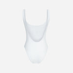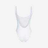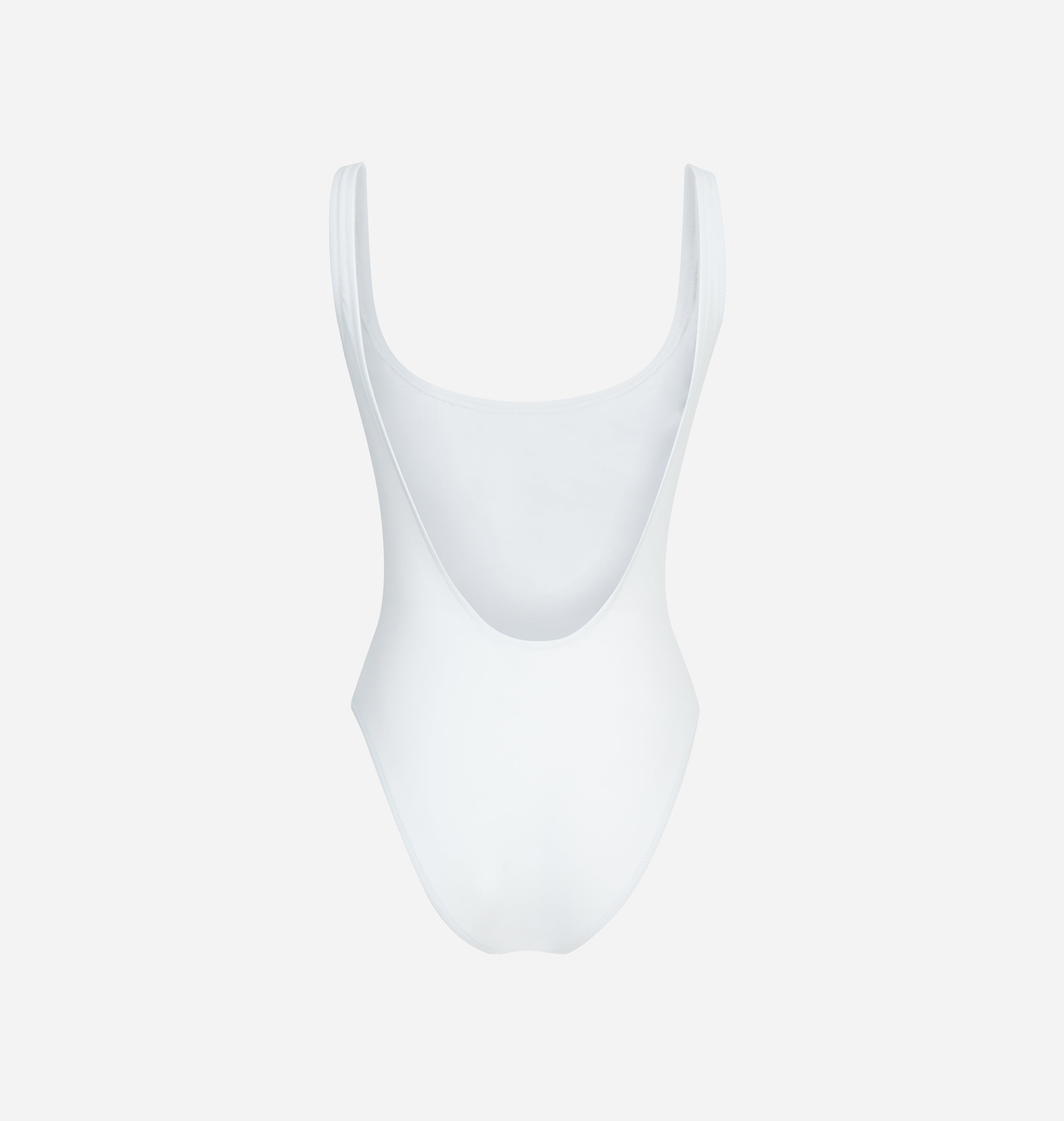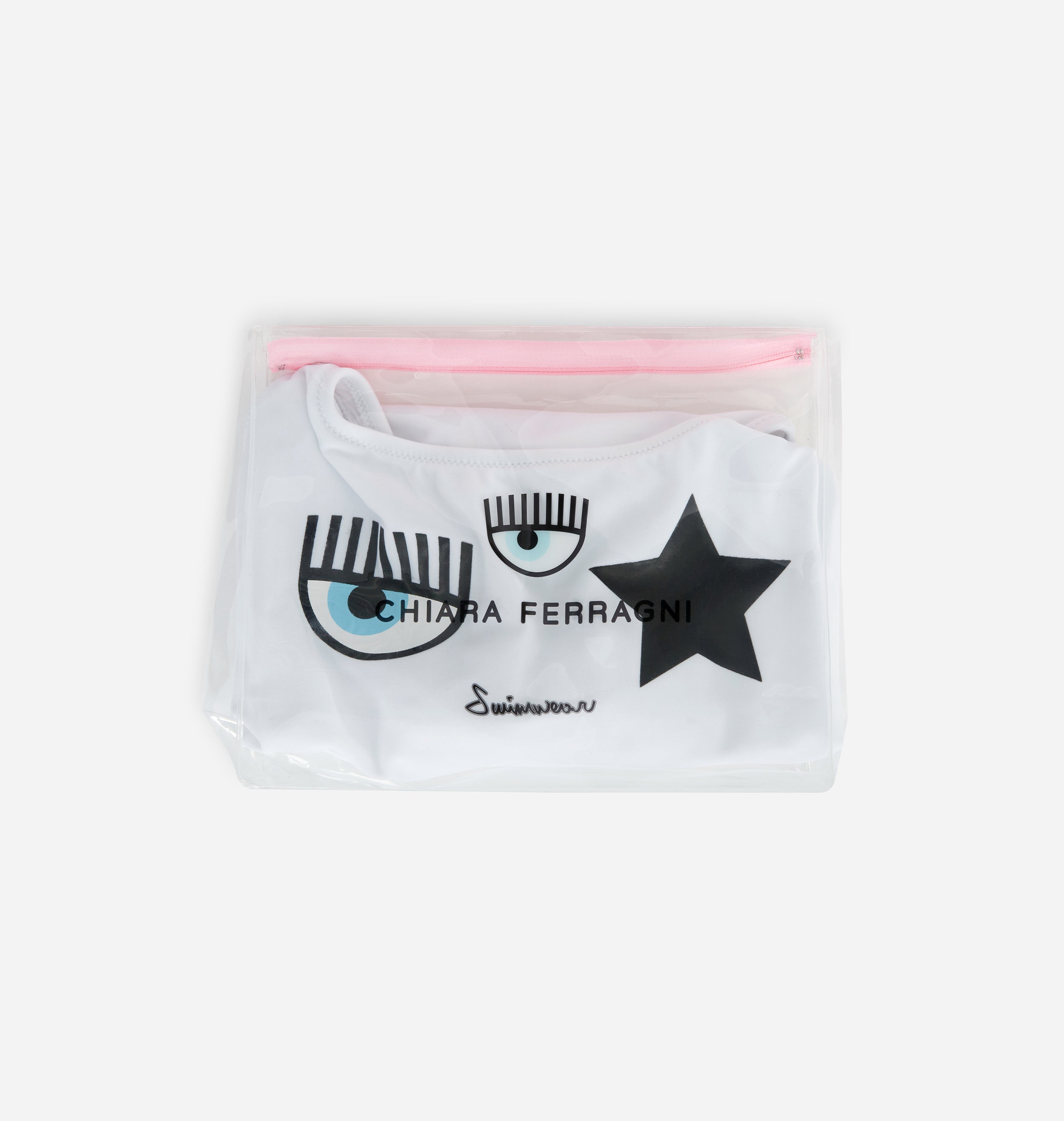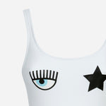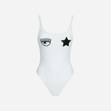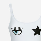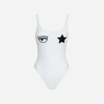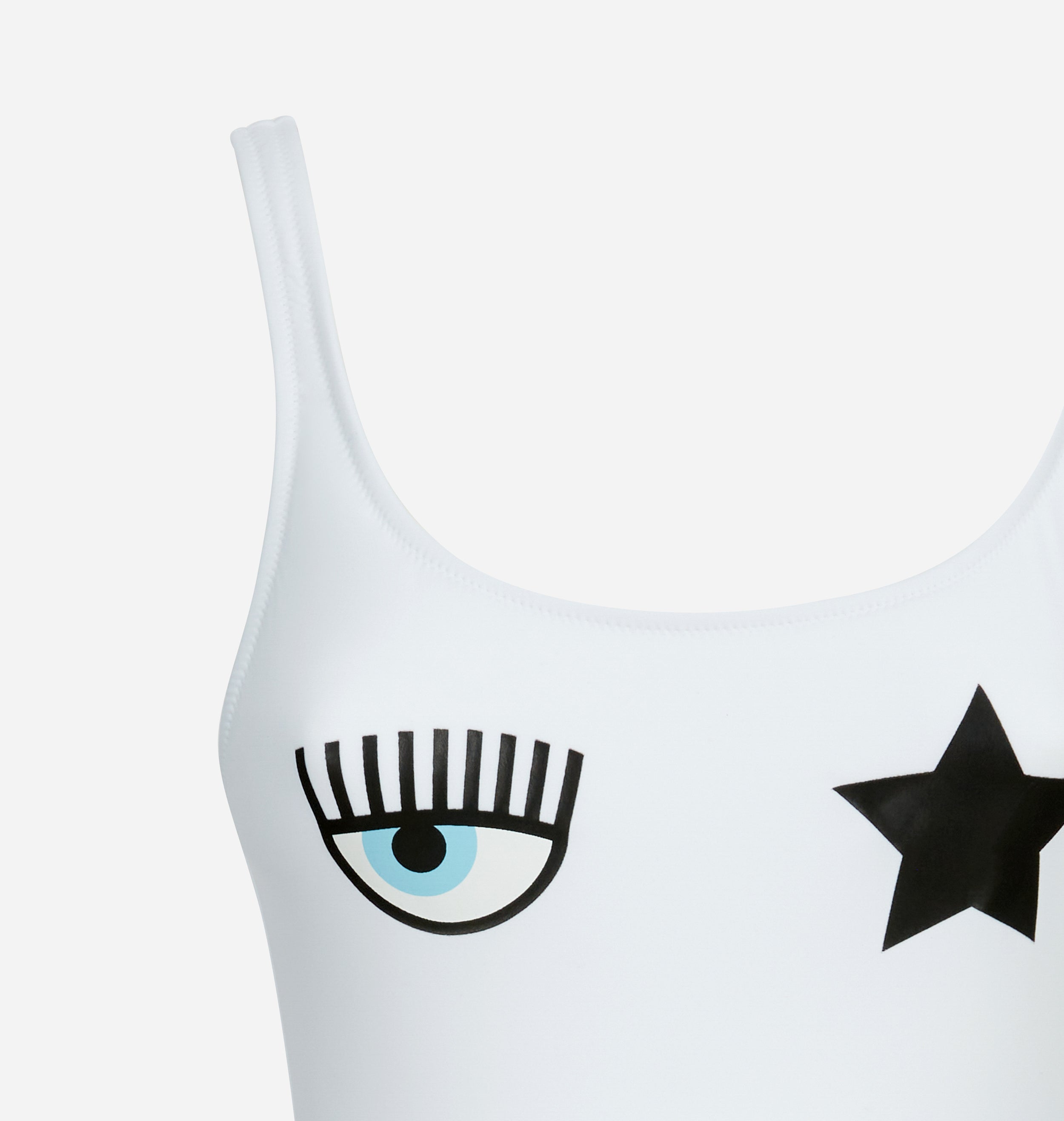 WHITE ONE-PIECE SWIMSUIT WITH PLUNGE BACK AND EYESTAR PATTERN ON THE FRONT