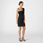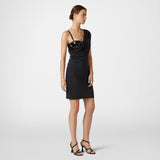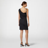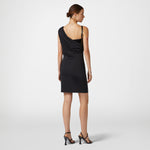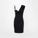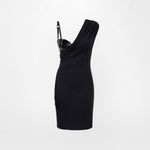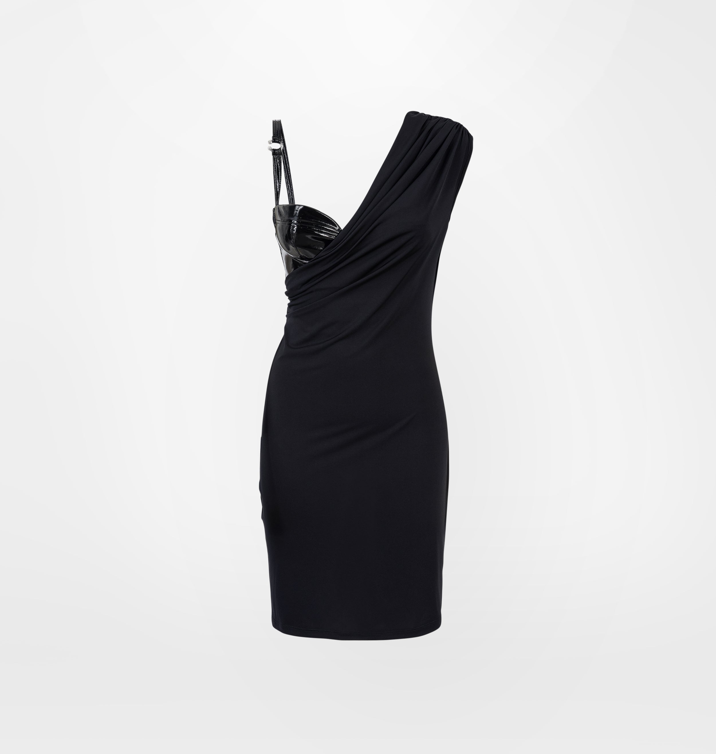 Short one-shoulder dress in black jersey with a shiny coated fabric top and rhinestone piercing on the shoulder strap.