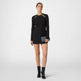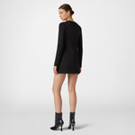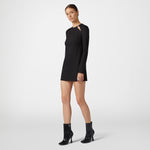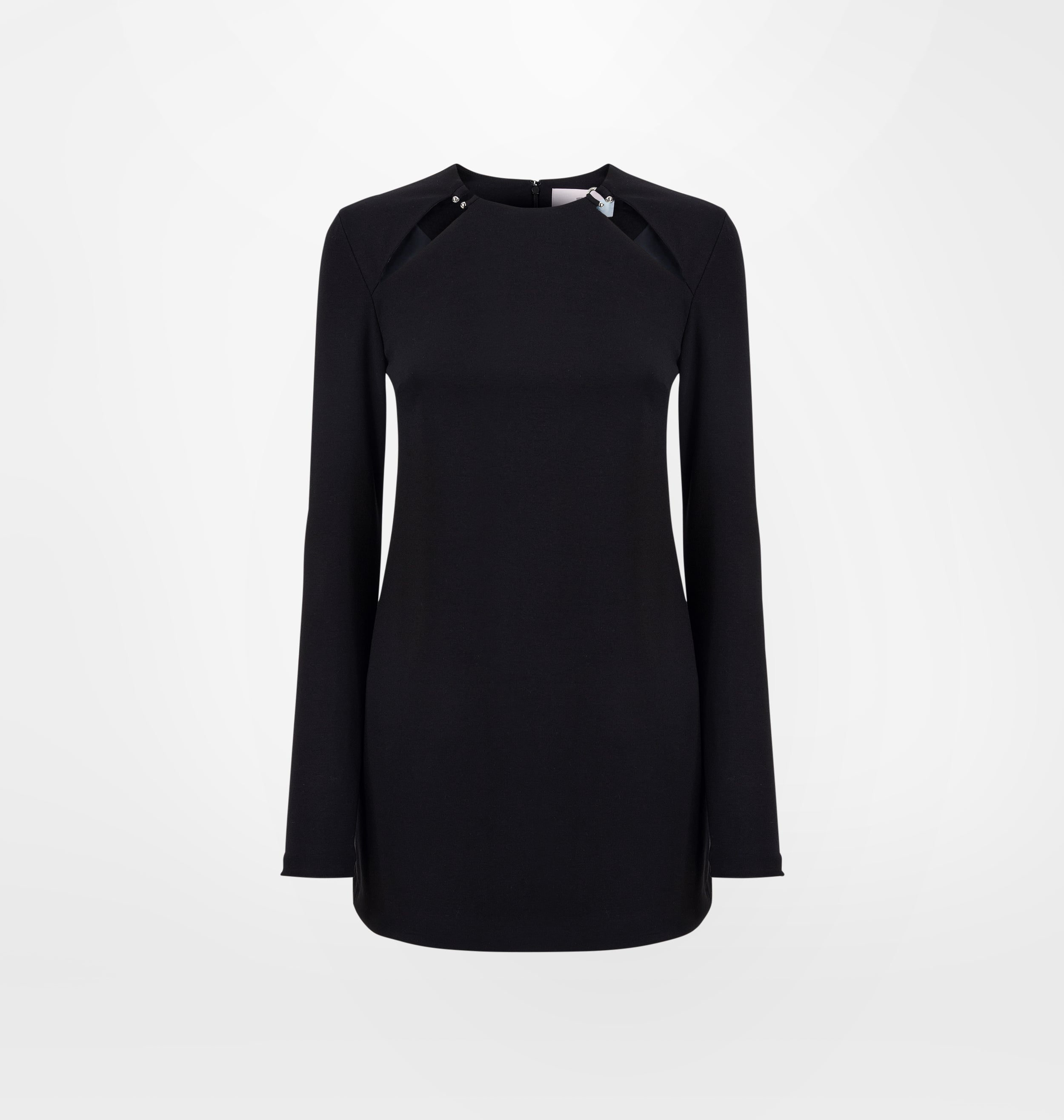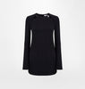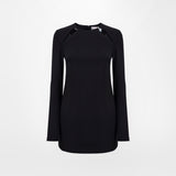 Black viscose short dress with long sleeves and piercing motif on the front neckline.