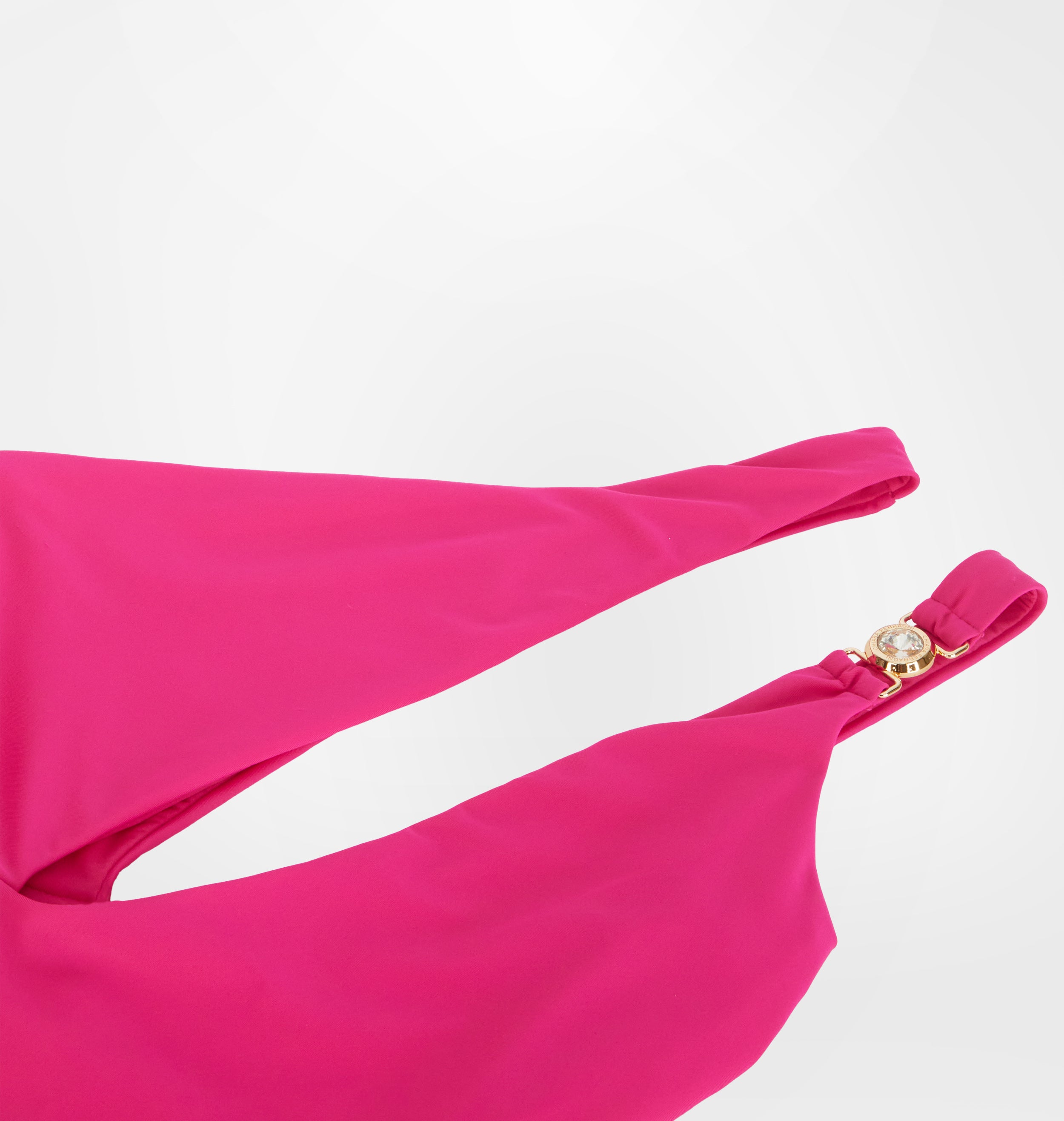 Fuchsia one-piece swimsuit with gold detail and maxi rhinestones.