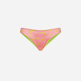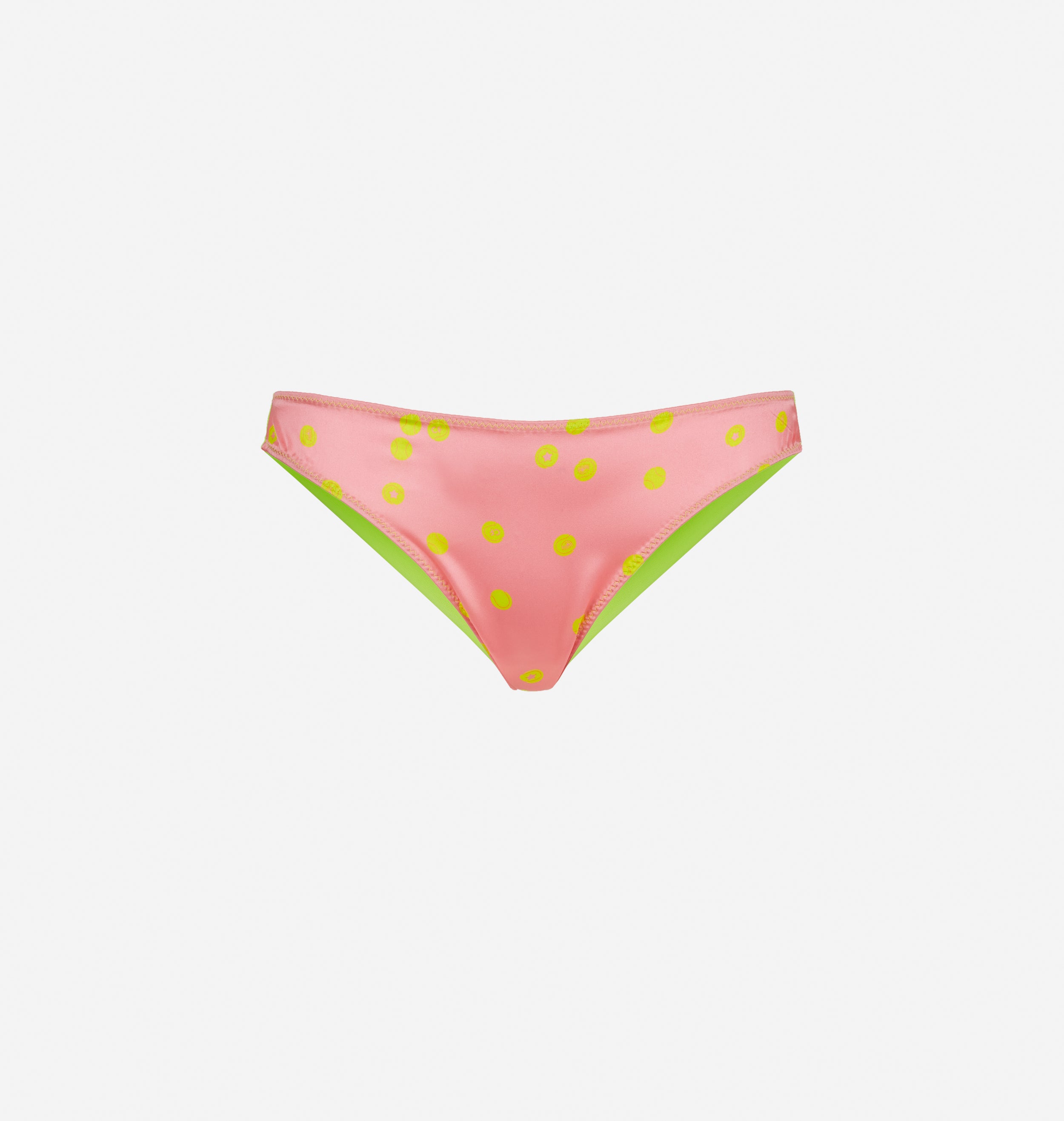 Pink satin brazilian brief with tennis balls print, back in neon yellow mesh
