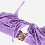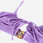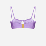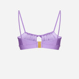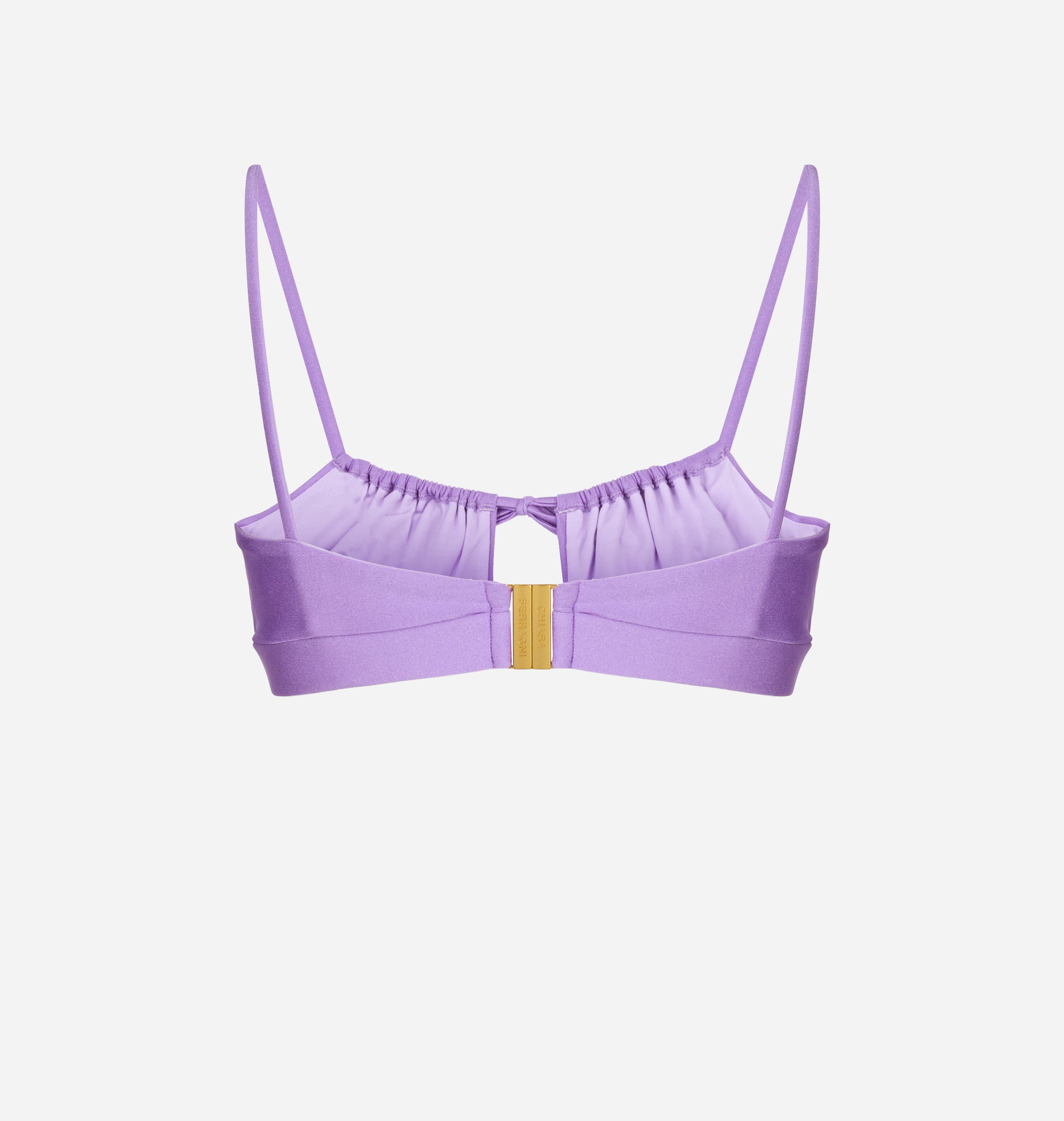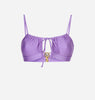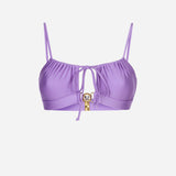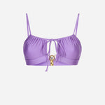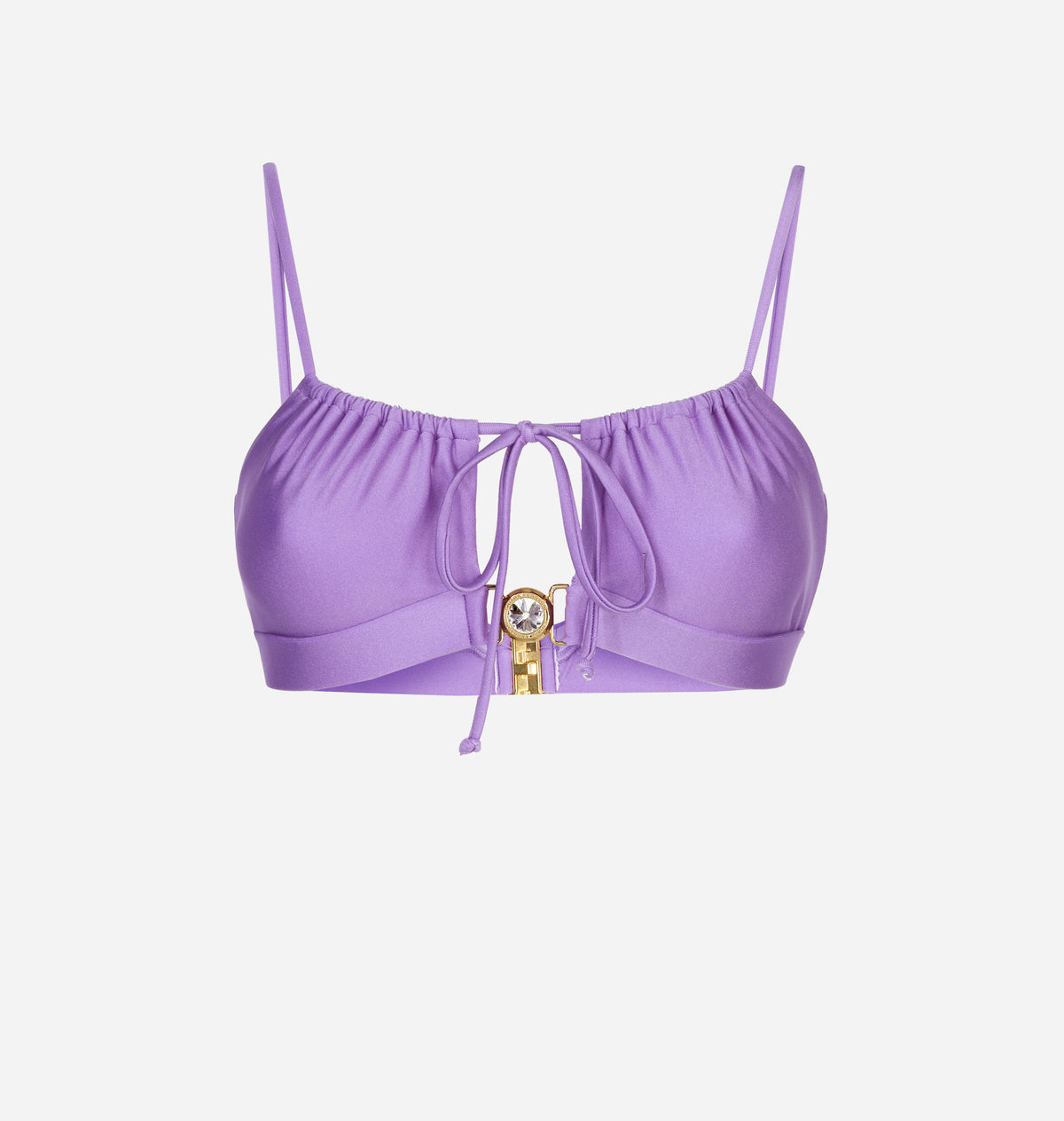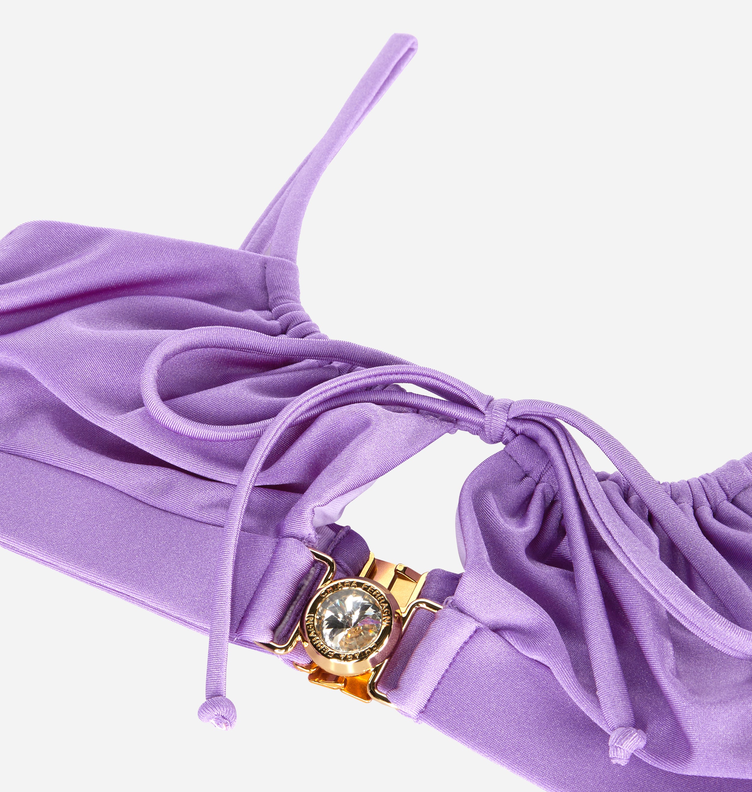 Top bikini lilla, modello a fascia morbido con laccetti e dettaglio dorato con maxi strass.