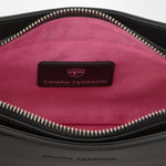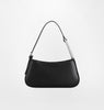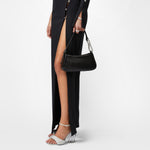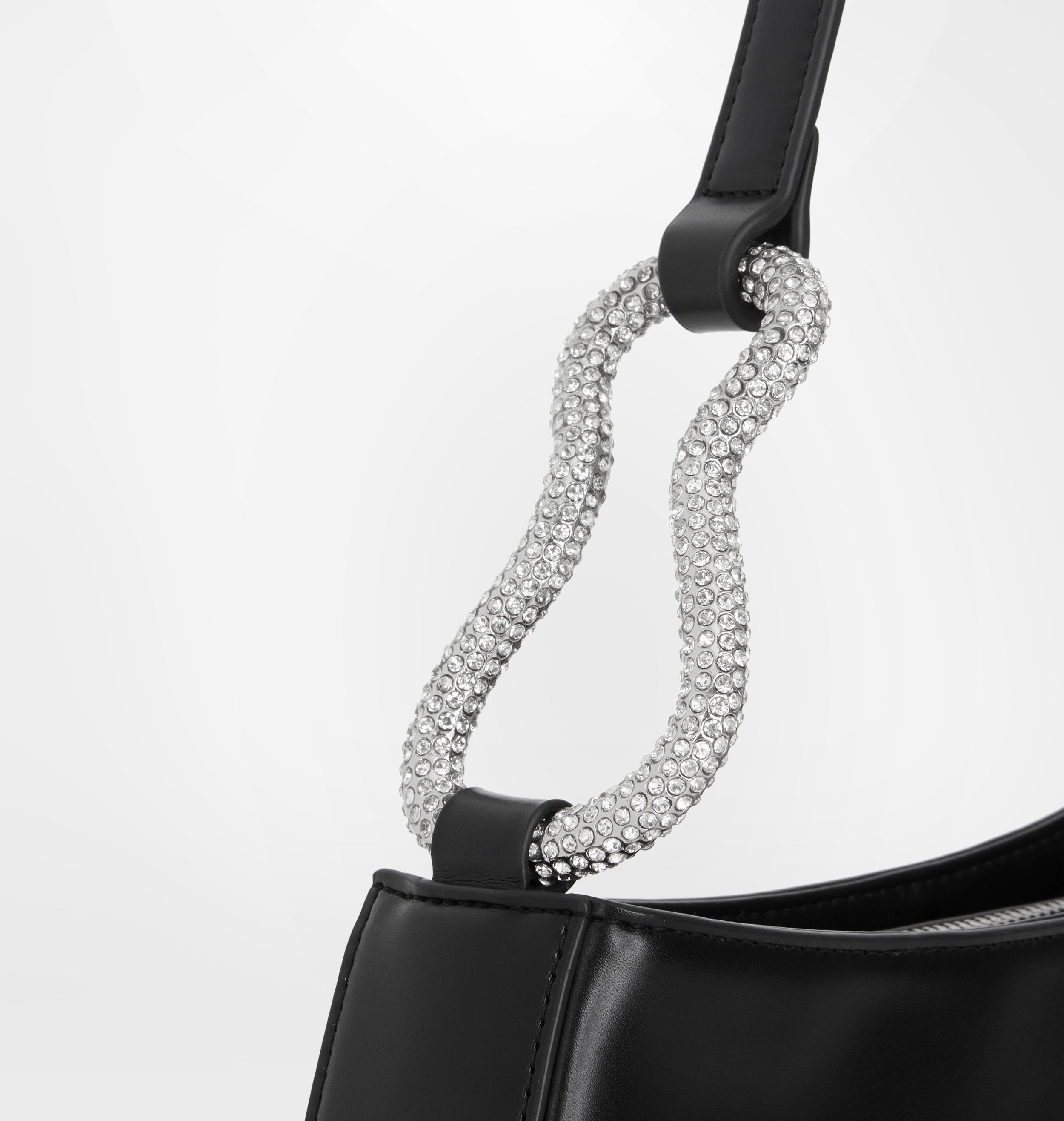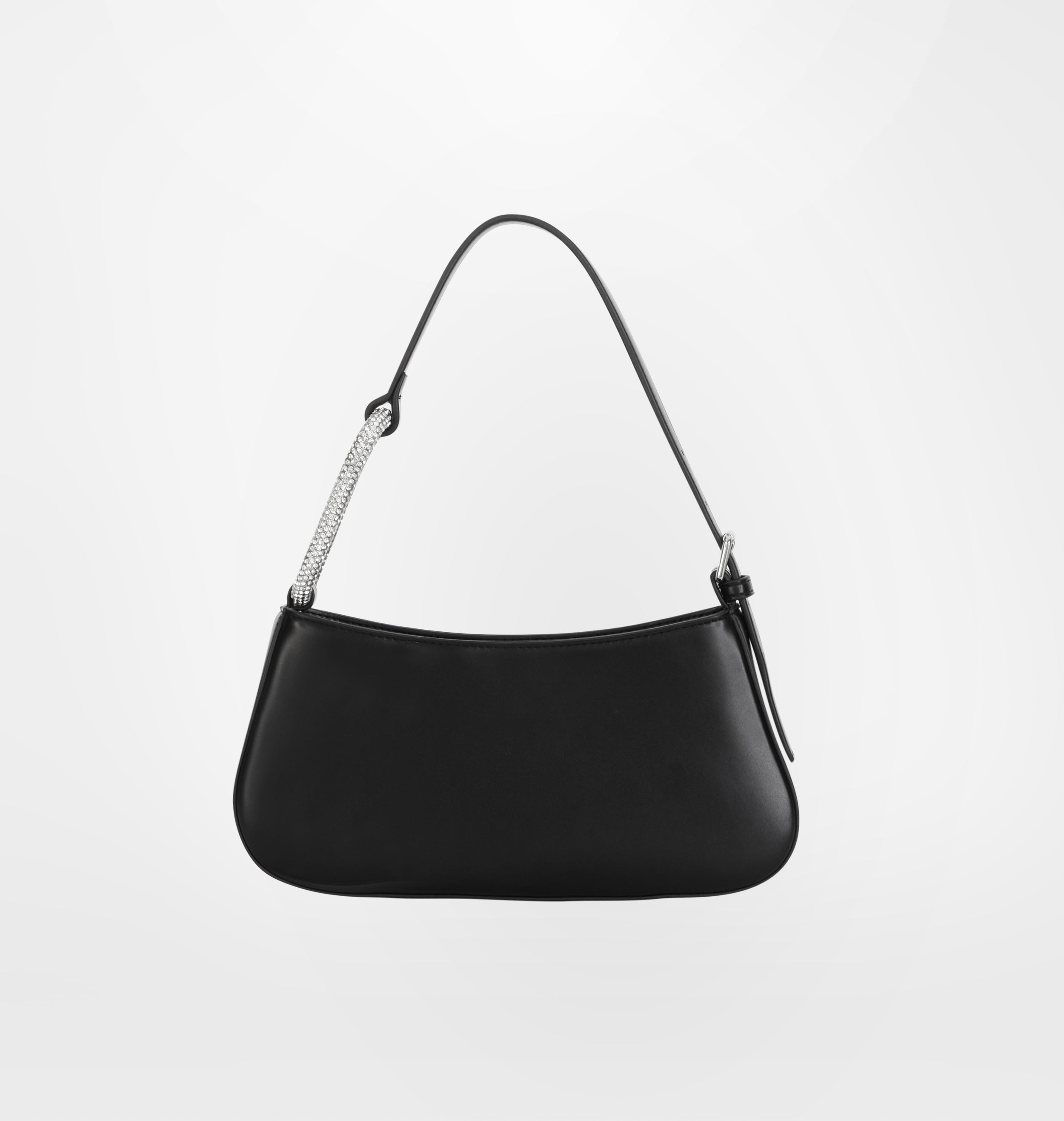 Borsa a spalla nera in materiale sintetico spazzolato lucido, con loop strass applicato sul manico. Chiusura con zip.