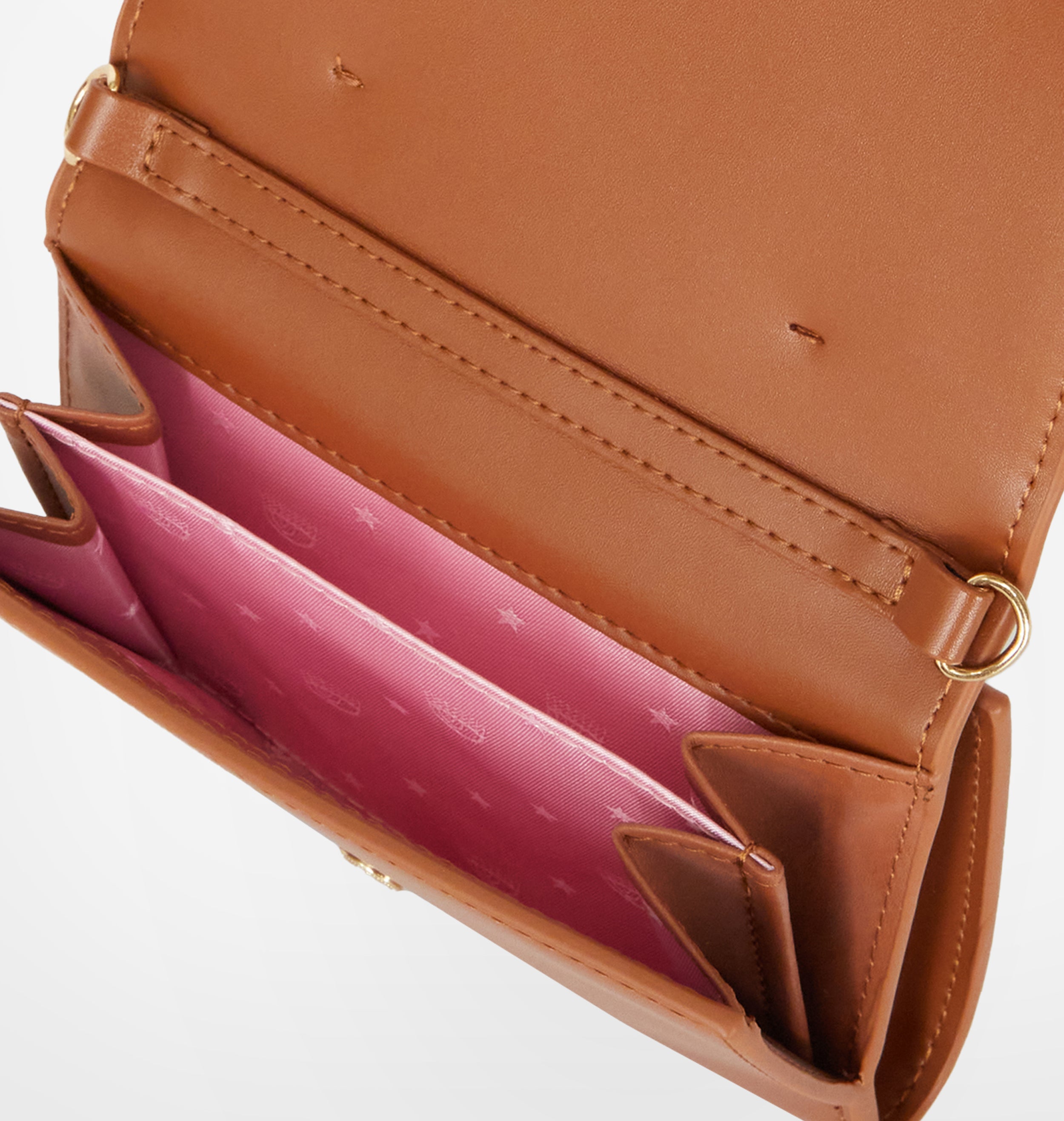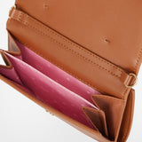 Portacarte in materiale sintetico lucido marrone aranciato, con logo Eyelike applicato su pattina frontale. Interno con porta carte e porta banconote.
