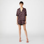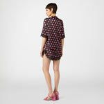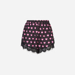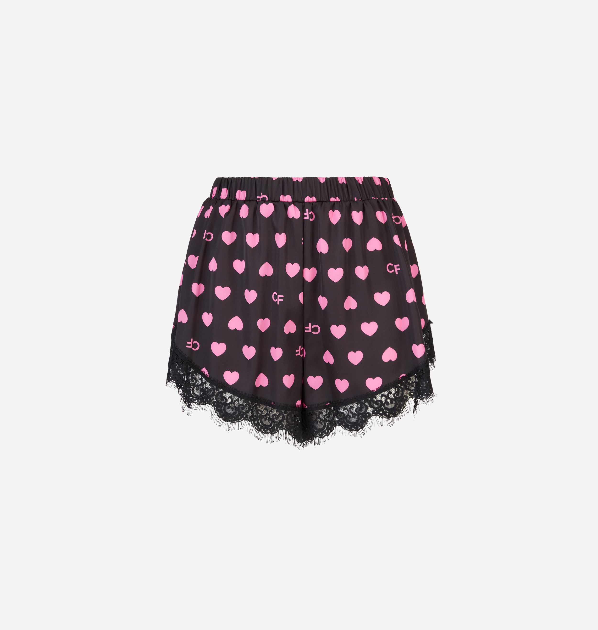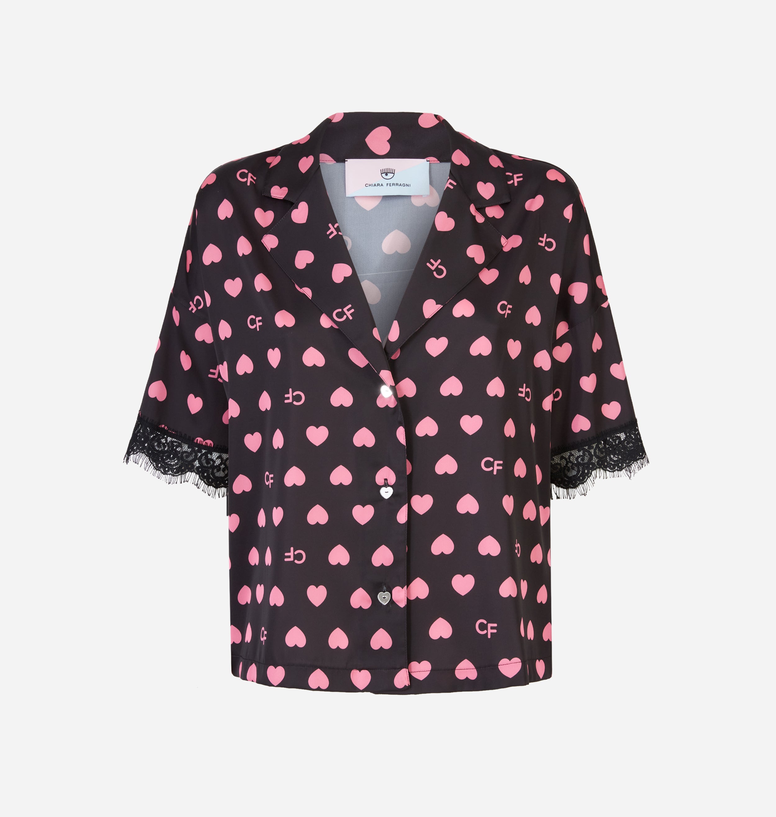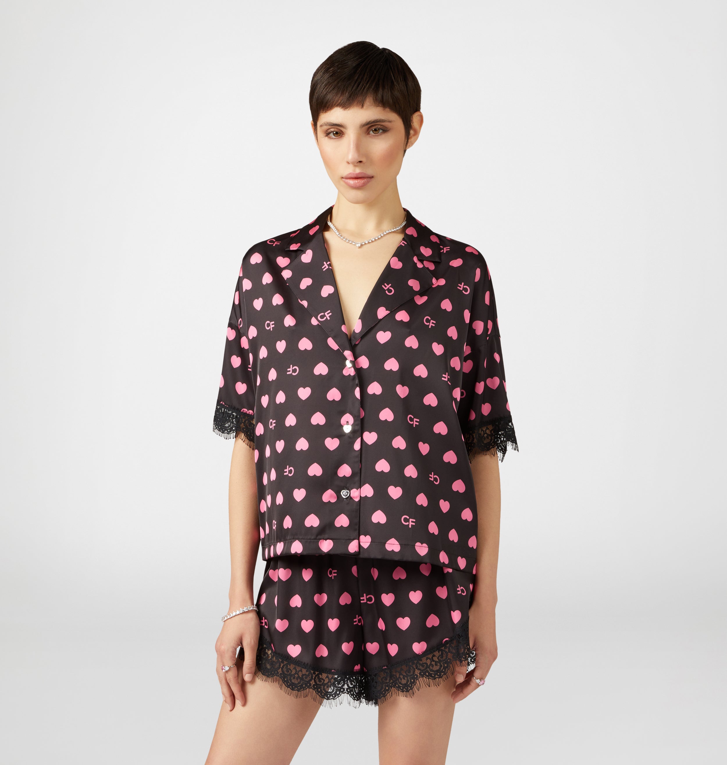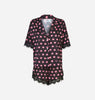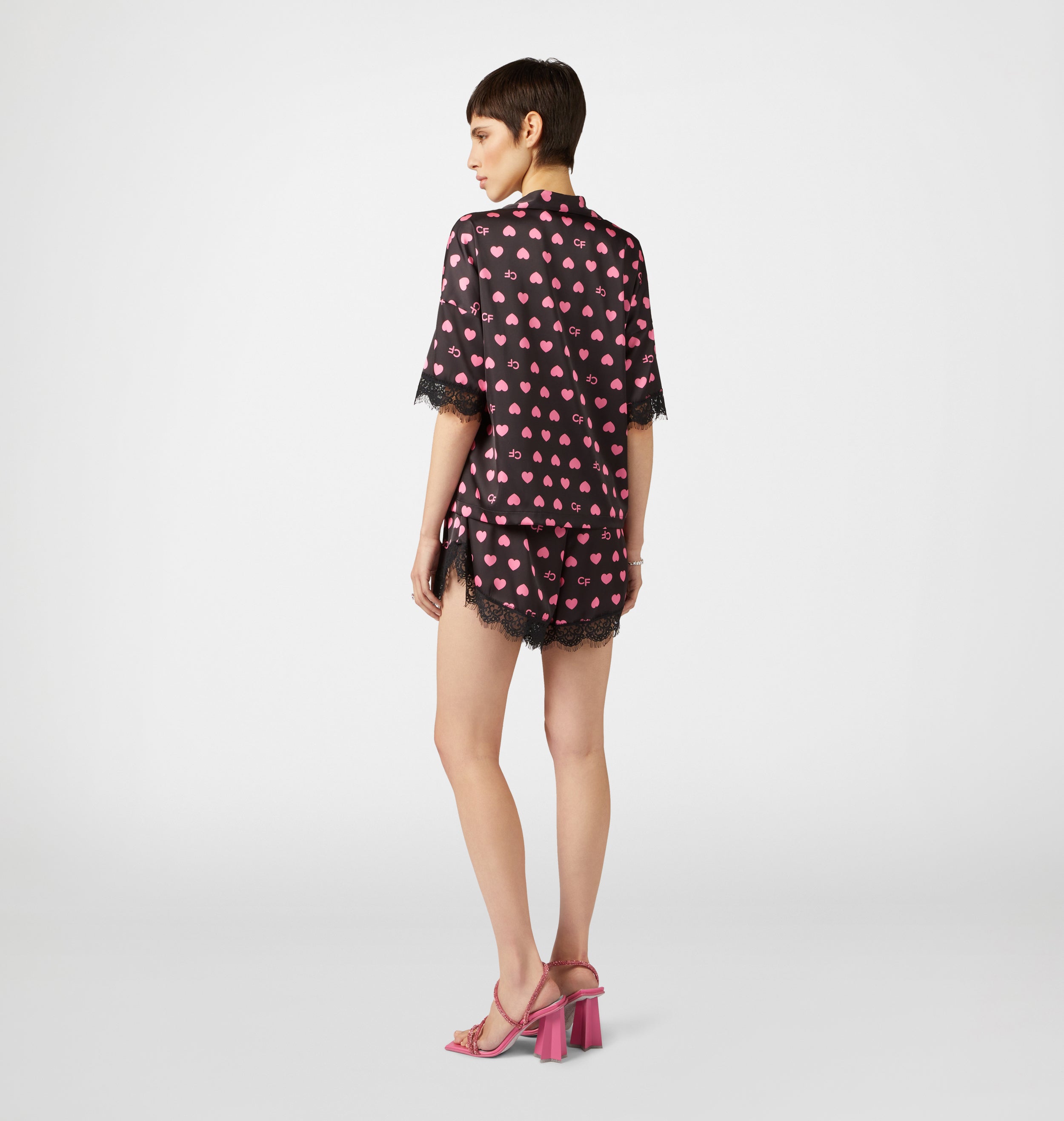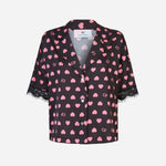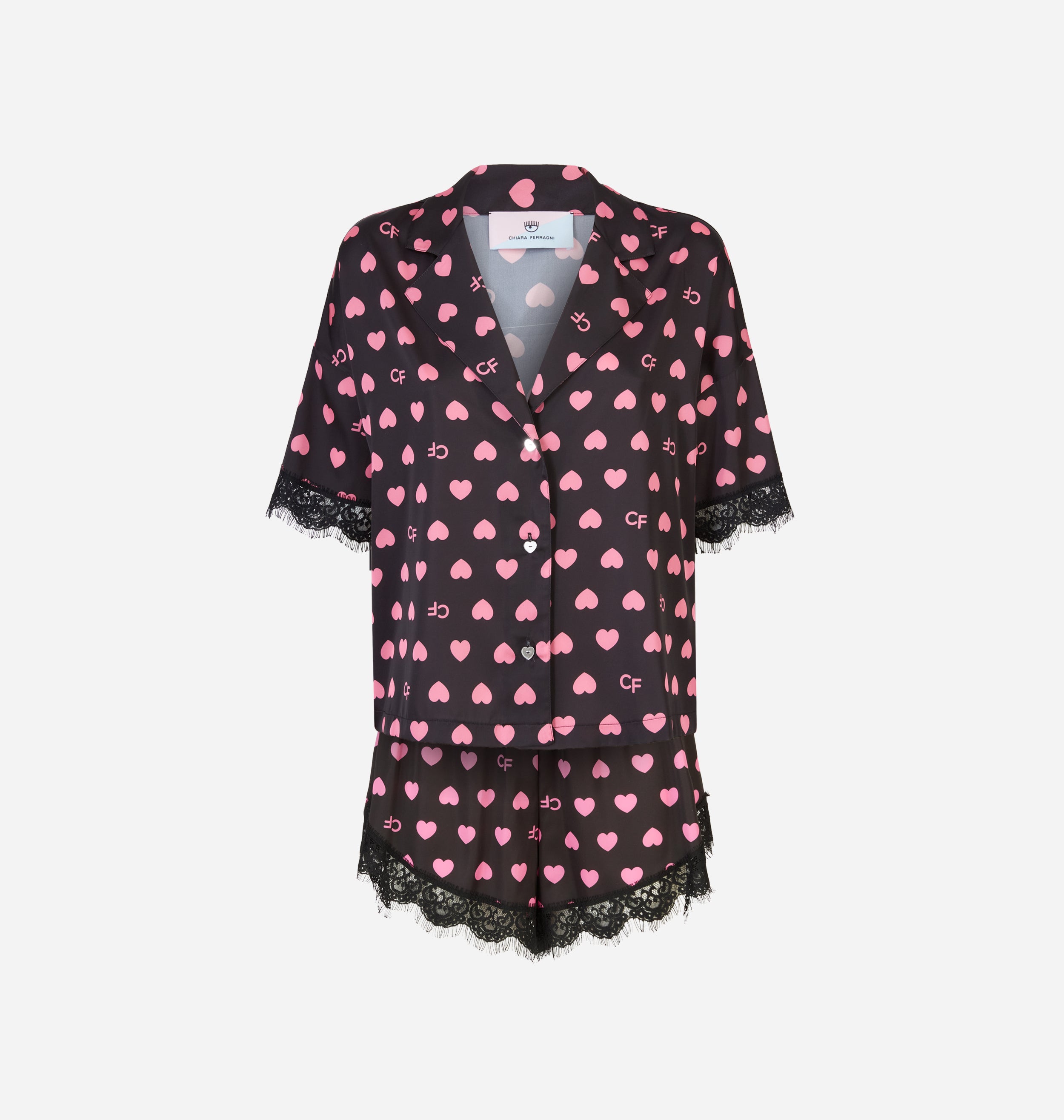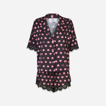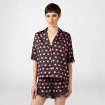Pigiama lungo in satin nero con stampa a cuori rossi e dettagli in pizzo, apertura frontale e chiusura a bottoni
