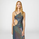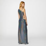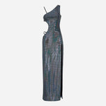 Vestito lungo monospalla in un tessuto elasticizzato con dettagli specchiati e iridescenti. Ampio spacco e cut out sul fianco dotato di un laccetto regolabile in due altezze