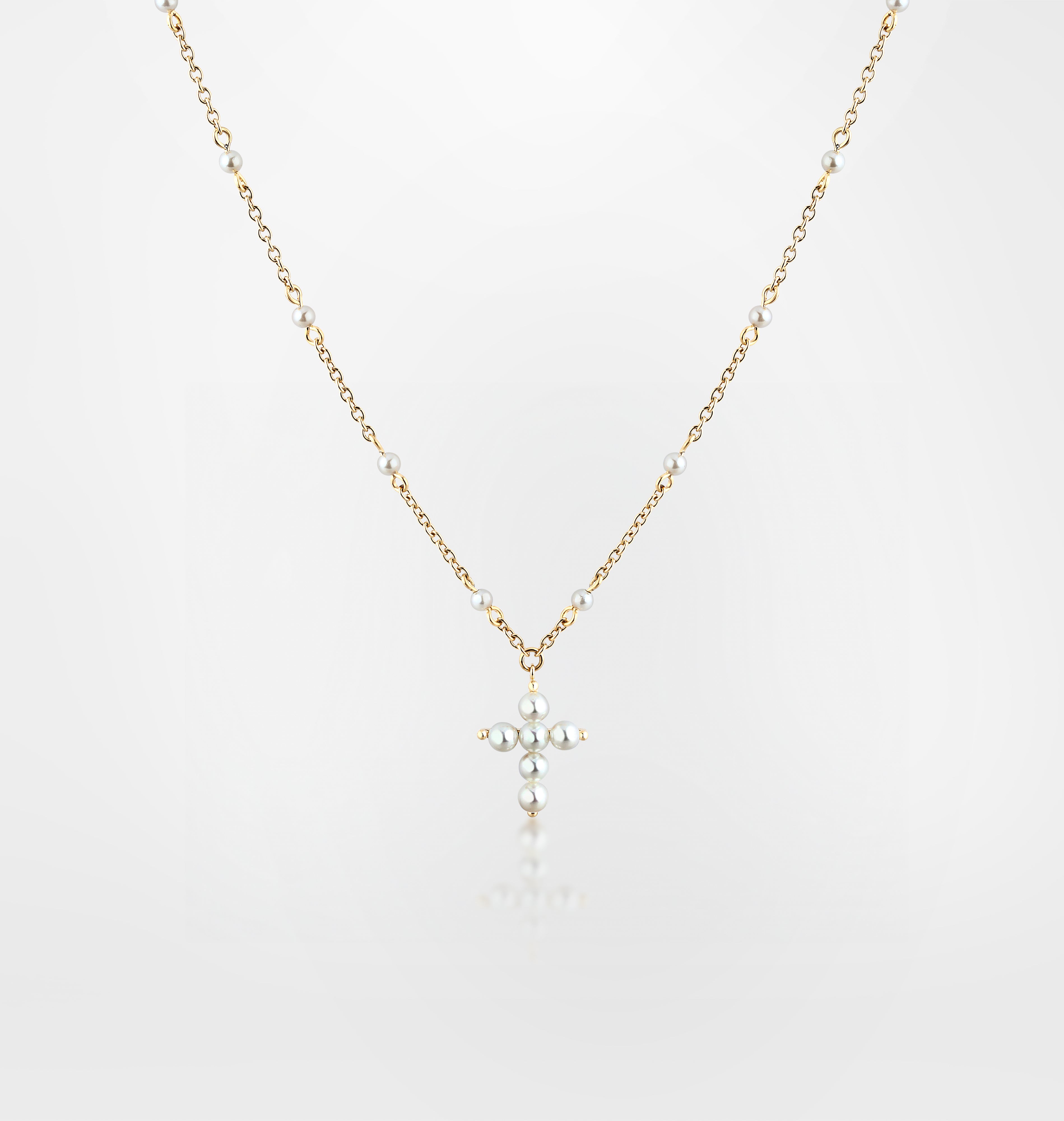 Un girocollo delicato ma con personalita: sottile catenina placcata oro 18k, punteggiata da piccole perle sintetiche e impreziosita da una croce pendente. La catena di estensione rende tutto piu semplice, permettendo di regolare la lunghezza in base all'occasione o all'umore. Un accessorio che unisce leggerezza e carattere, pensato per dare luce a qualsiasi look.
