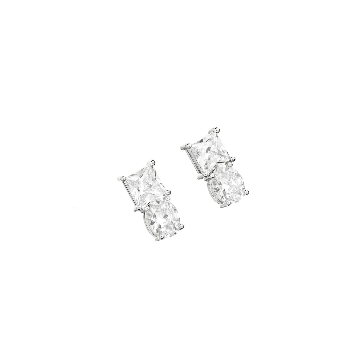 Orecchini con zirconi bianchi placcati in rodio, una pietra dal taglio quadrato ed una pietra dal taglio ovale.