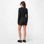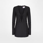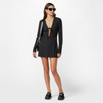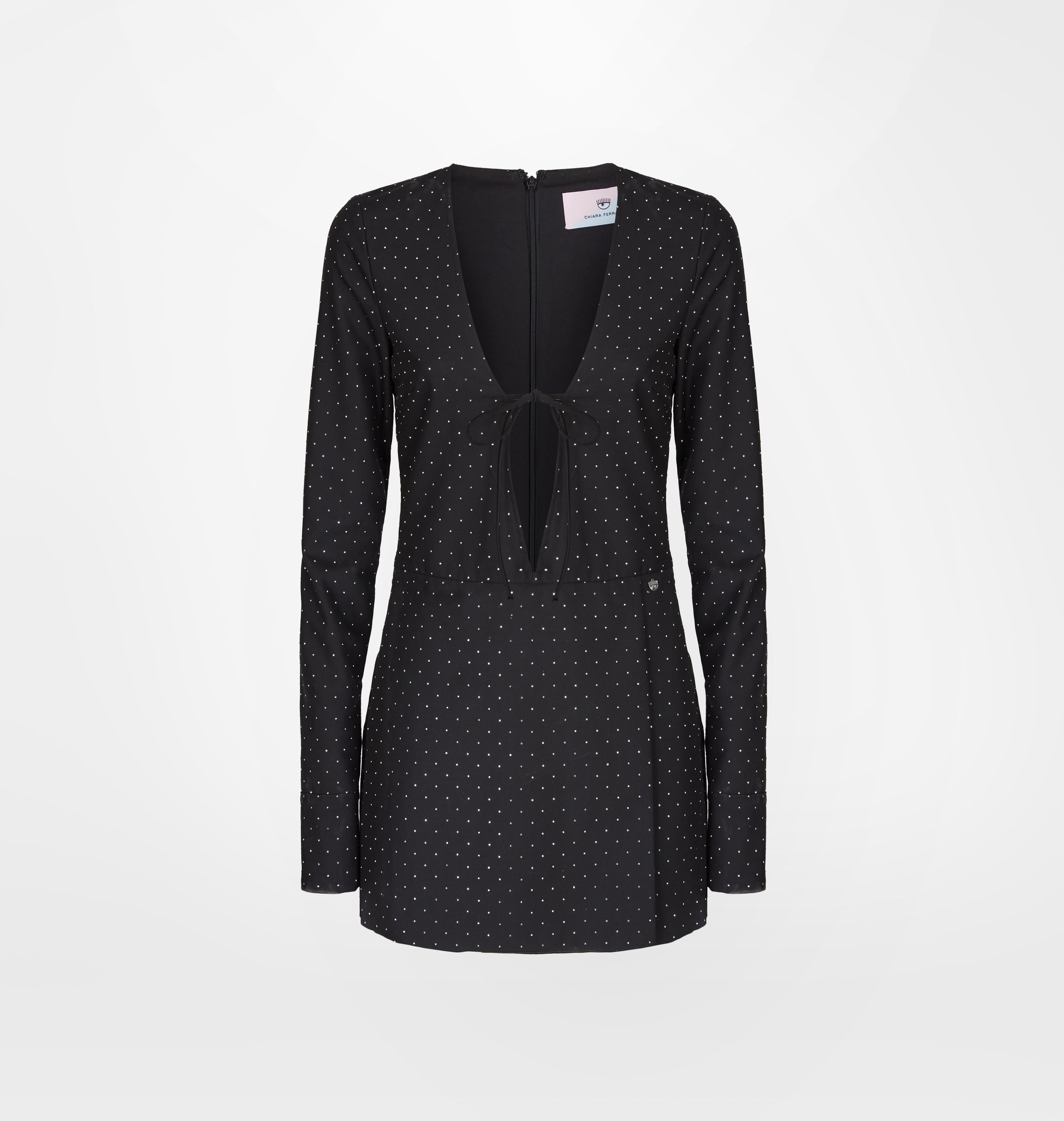 Short dress with black gabardine shorts and all-over rhinestone application. Long sleeves and deep front neckline with drawstring fastening.