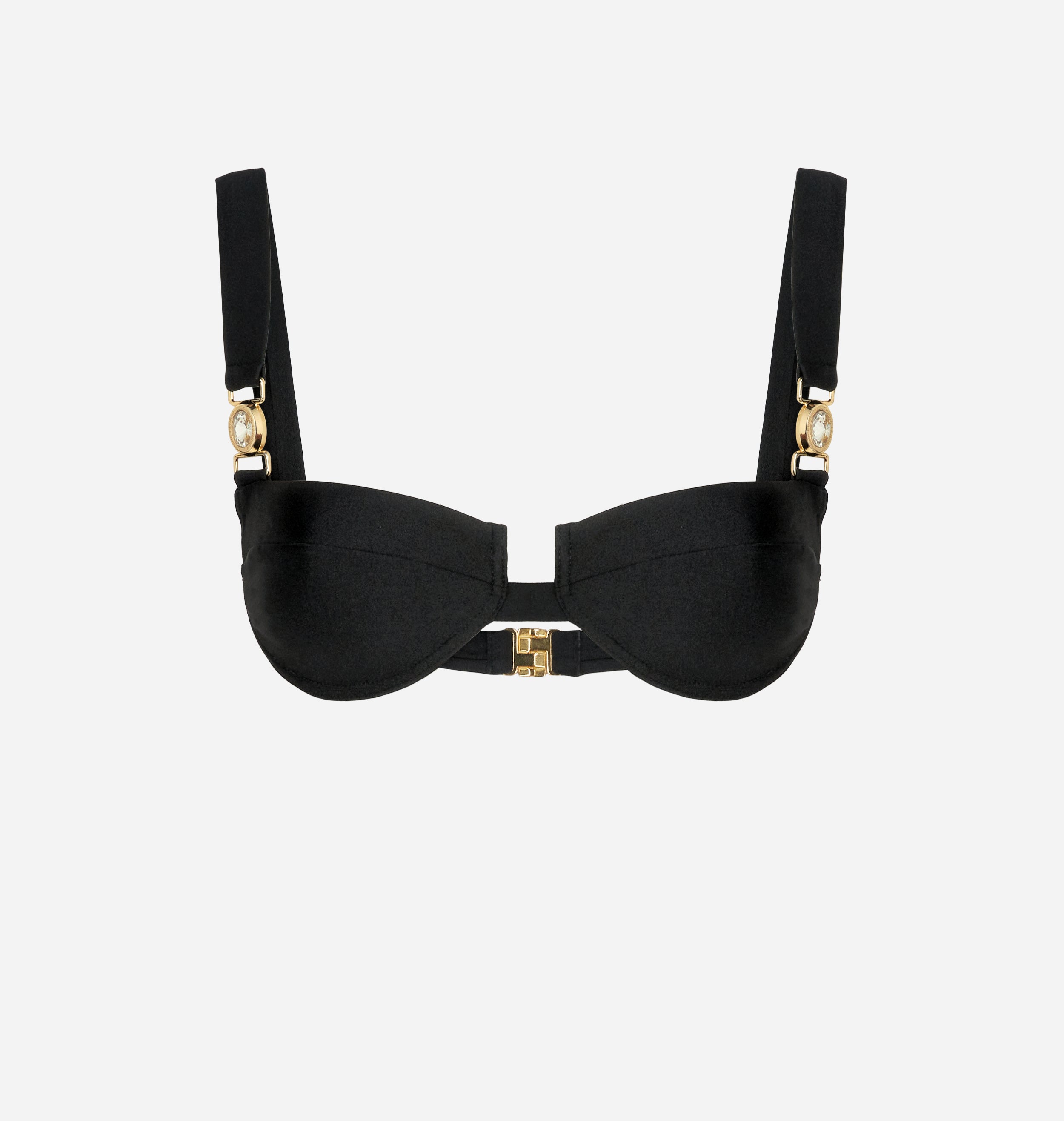 Black balconette bikini top with underwire and golden detailing with maxi rhinestones.