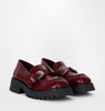 Mocassino in pelle bordeaux con fibbie. Suola in gomma e punta squadrata.