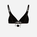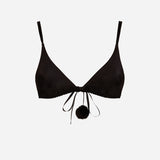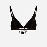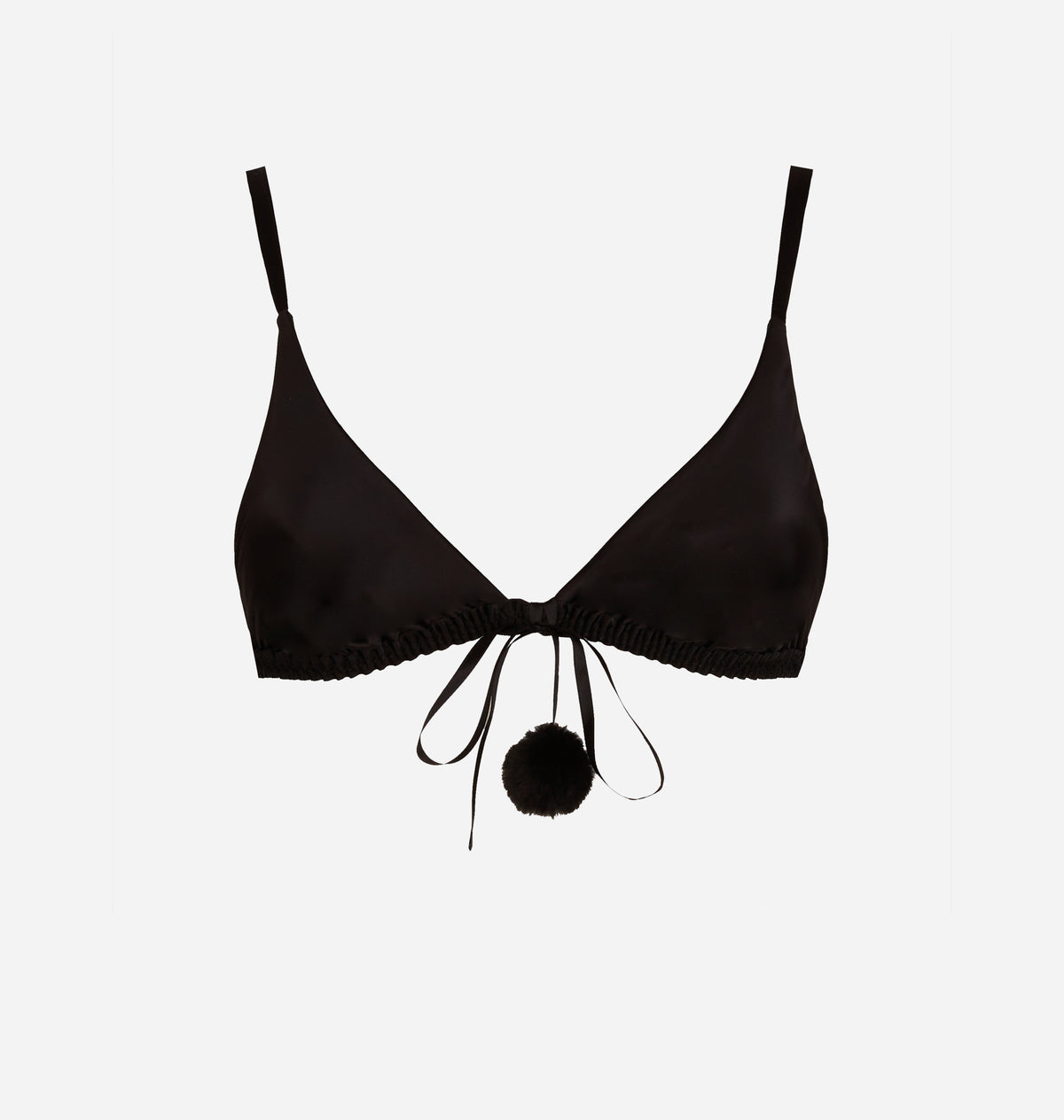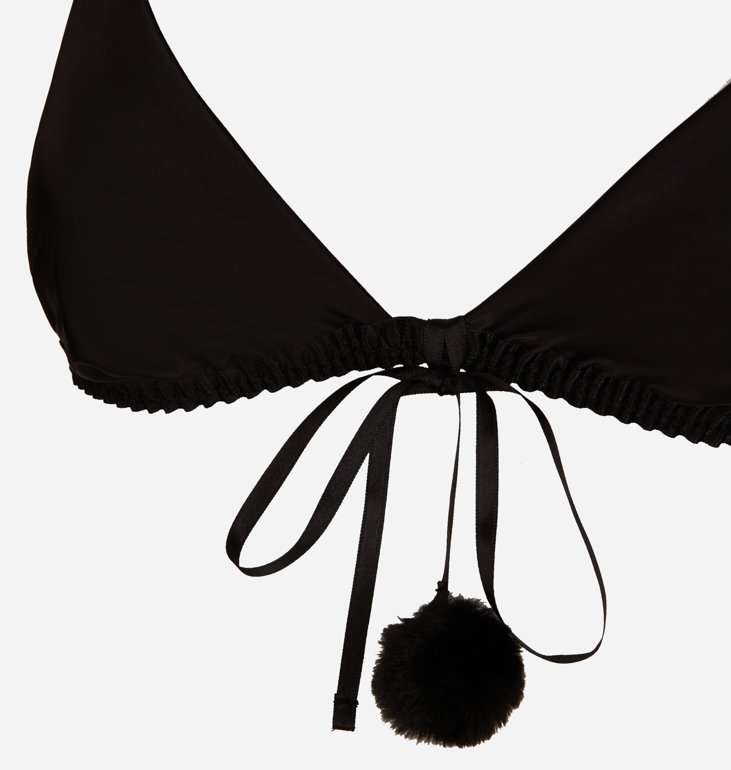 Black satin triangle bra with removable central straps embellished with pom-pons
