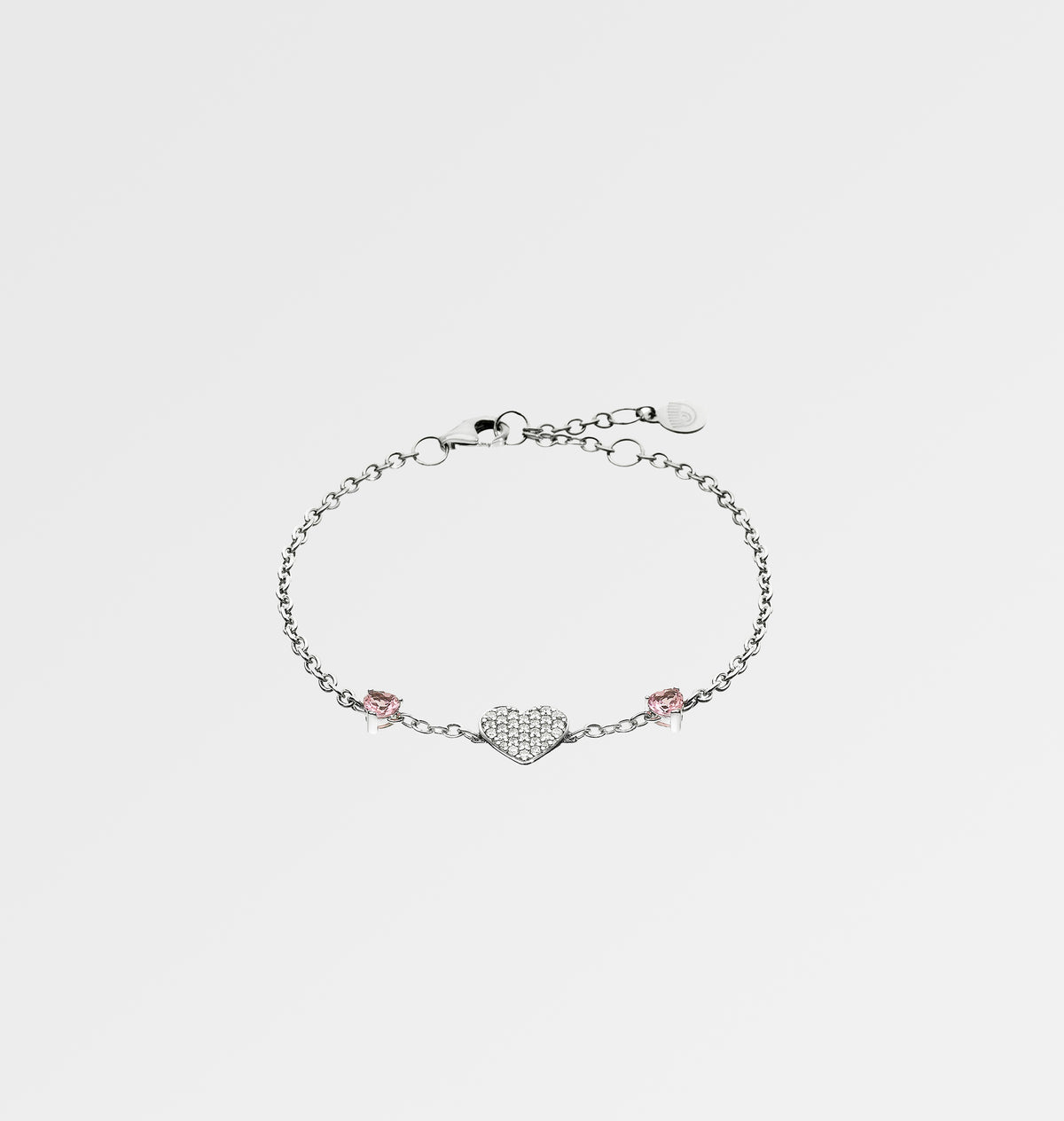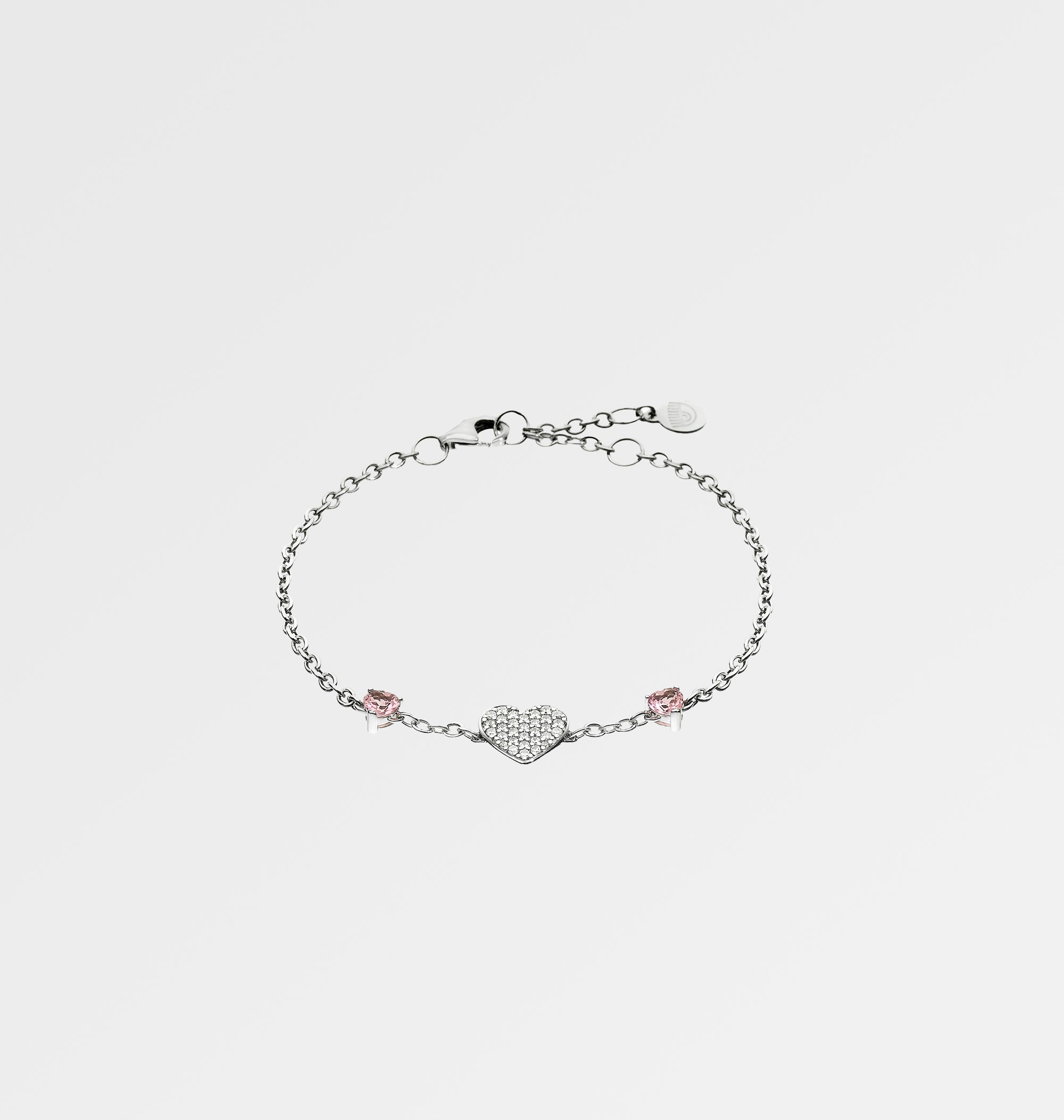 Bracelet made of 925 sterling silver with heart-shaped pink cubic zirconia and central charm with white cubic zirconia pave.