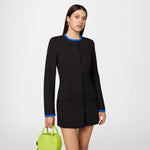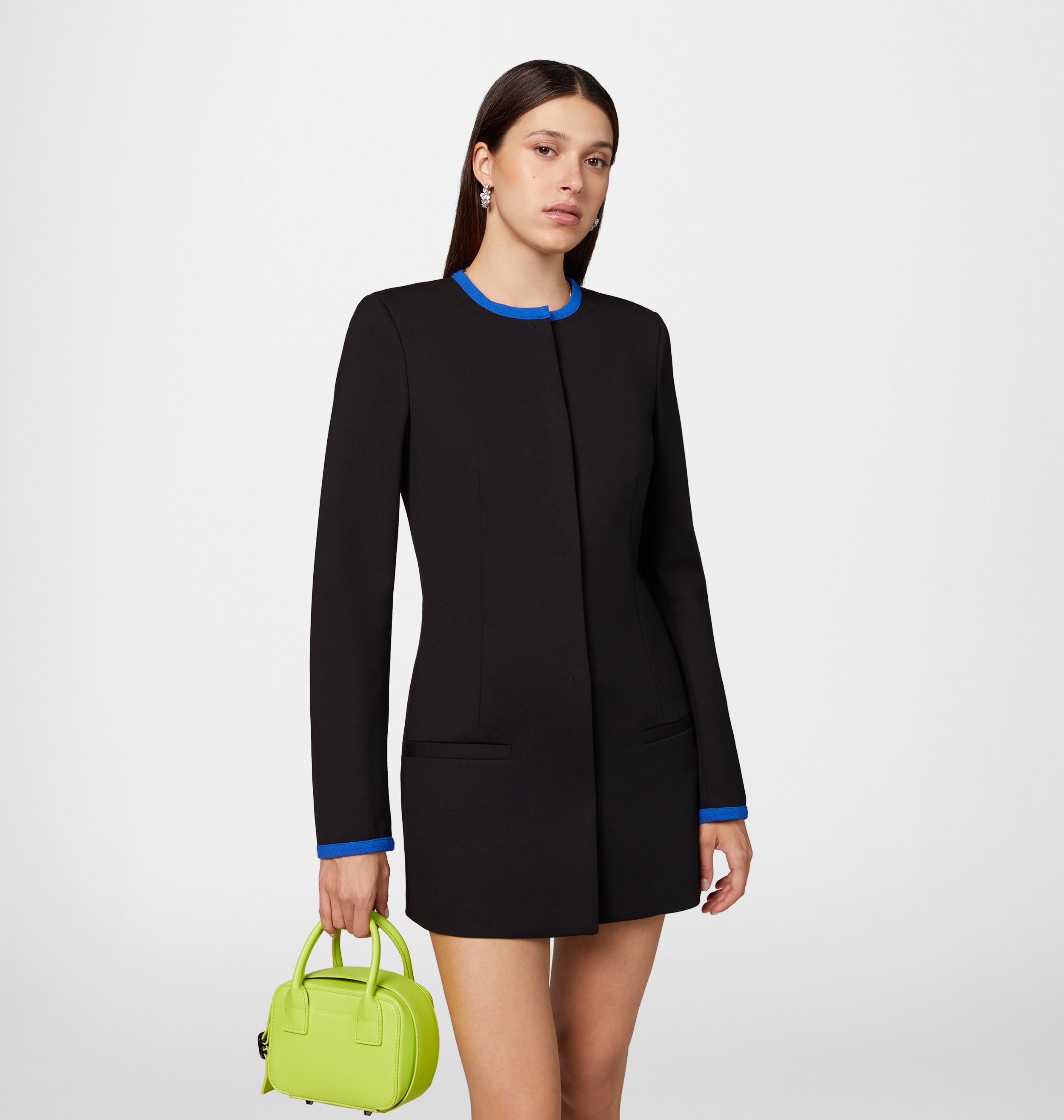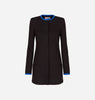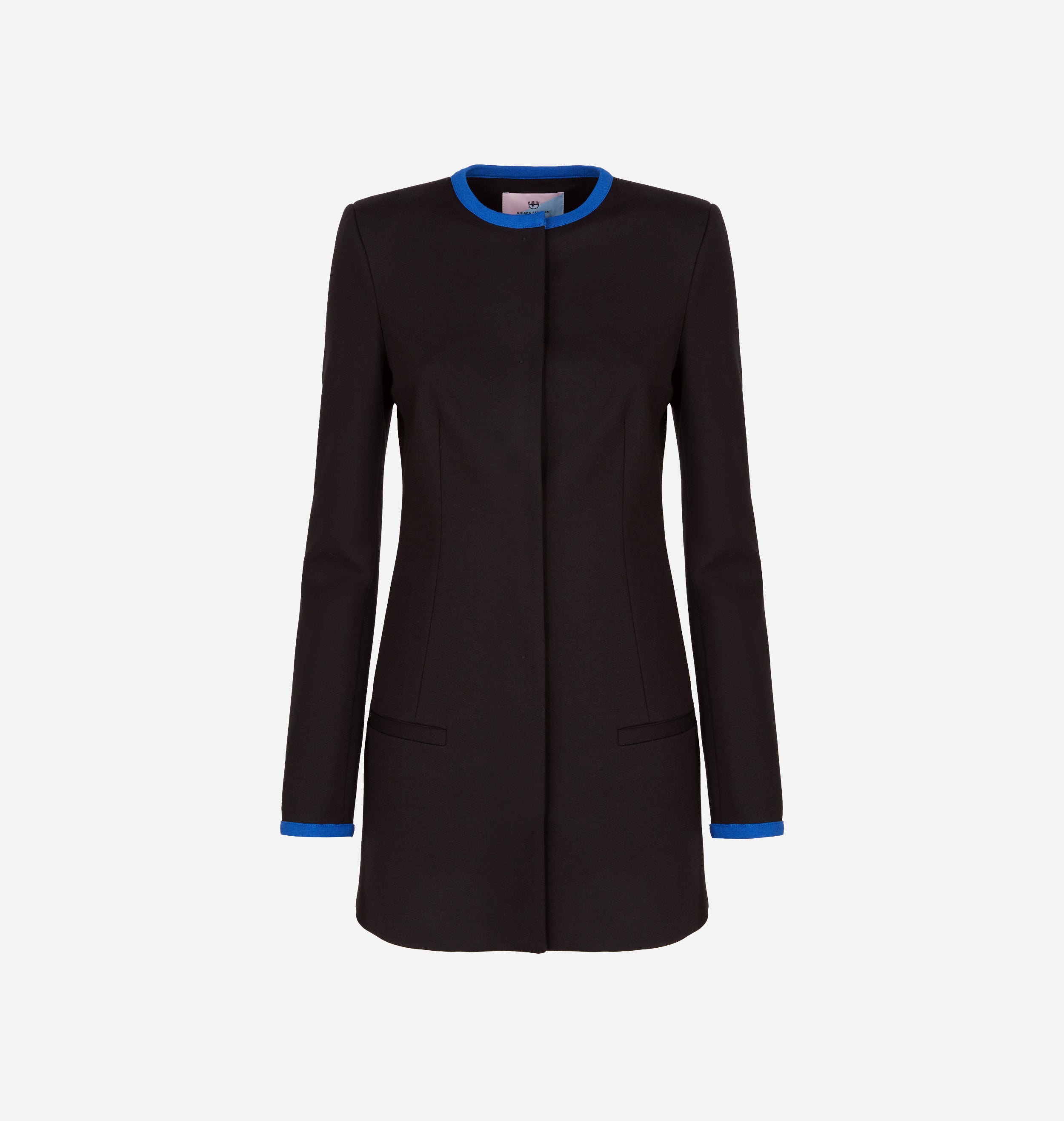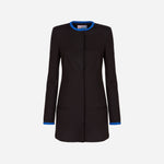 Long crew-neck jacket in milano stitch, black with blue details. Slim fit, hidden button opening.